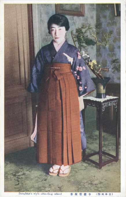 “For school girls, they wore andon bakama [lit. ‘lantern hakama’, named for its similarity in appearance to a Japanese paper lantern]. Different from men’s wear, it was specially designed by Utako Shimoda (a teacher and principal at the Girls’ Peer School) between 1920 and 1930 for schoolgirls to wear, with leather boots and bow tied on their hair.
