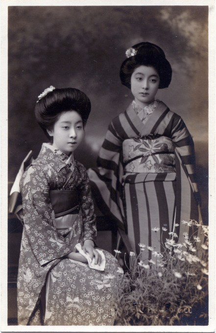 Two onnanoko [young women] posing with contrasting coiffures, c. 1910. The girl on the right has her hair done up in a traditional Japanese style, hana kanzashi; the girl on the left is wearing her hair in a Western style pompadour known as sokuhatsu.