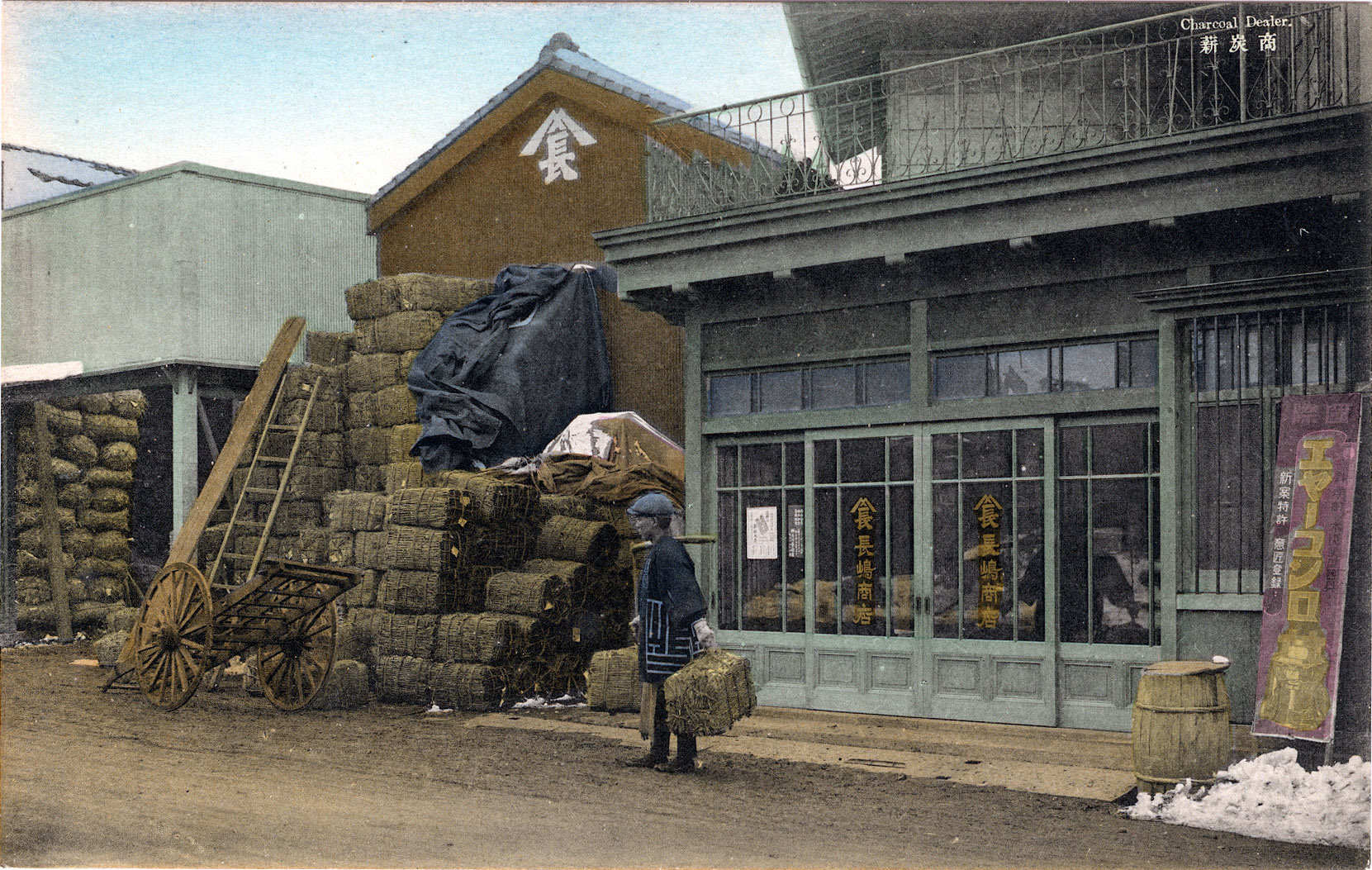 “Charcoal dealer”, Nagashima shoten, Japan, c. 1920. Bundling the charcoal in straw makes for easy transport and storage.