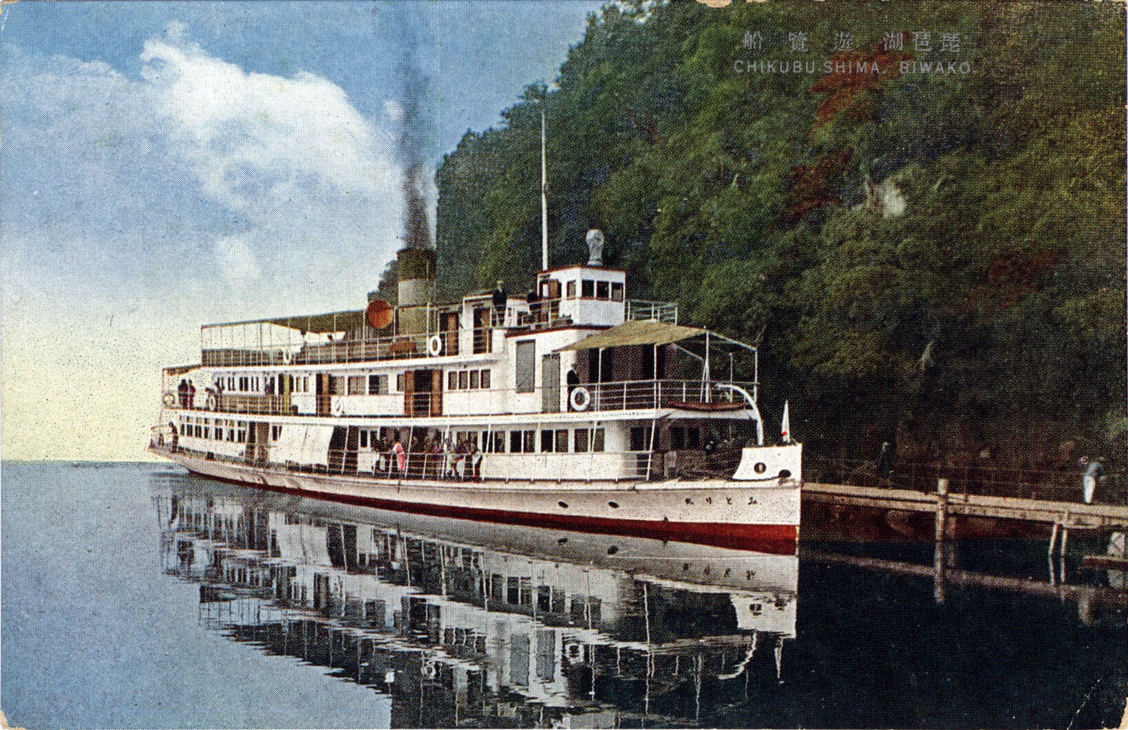 Ferry boat, Chikubu Island, Lake Biwa, c. 1940. On the small island, there is Hogonji Temple, first built in 724 and rebuilt in 1942, dedicated to Benzaiten. The temple is located on Chikubu island because it is believed that Benzaiten first came down to visit earth at that location.