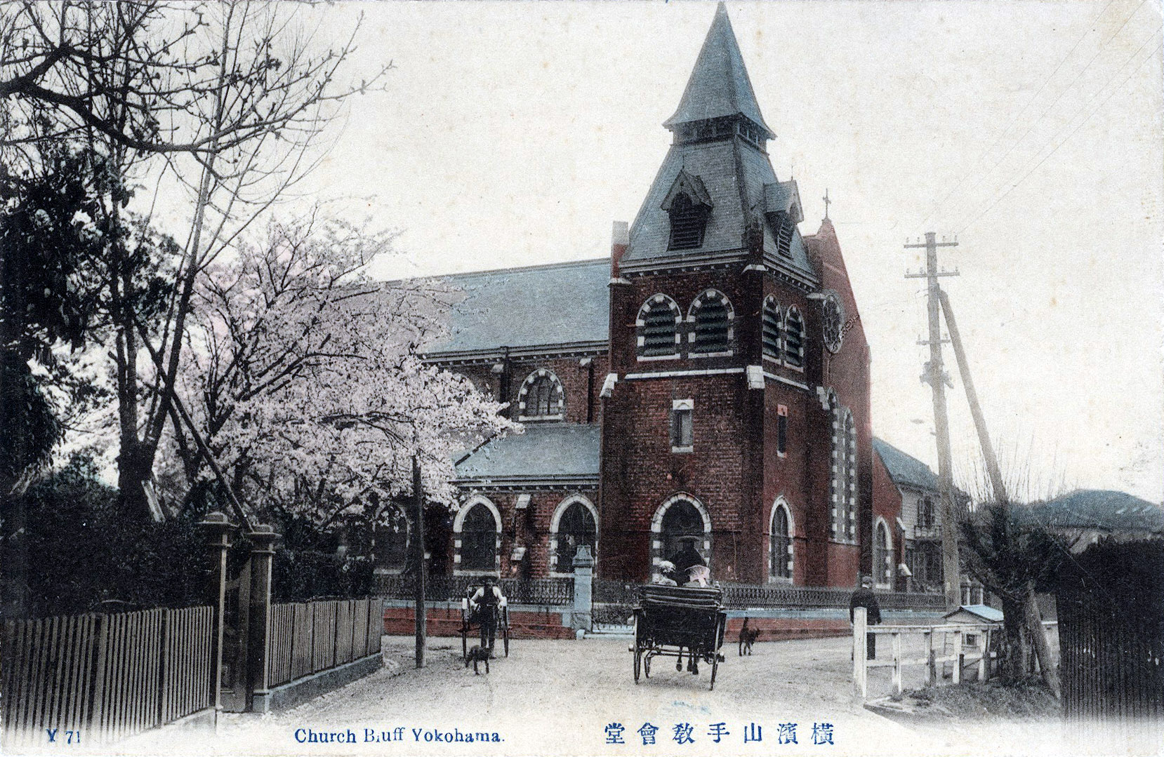 “教會堂, Christian teaching hall.” Christ Church (Anglican) on Colonel’s Corner, The Bluff, Yokohama, c. 1910. Constructed of Glasgow red bricks that had been carried as ballast by steamships arriving from Great Britain, the church would stand from 1901 until 1923, when it was leveled by the Great Kanto Earthquake. A scandal (of sorts) would envelop the church within a few years of its completion.