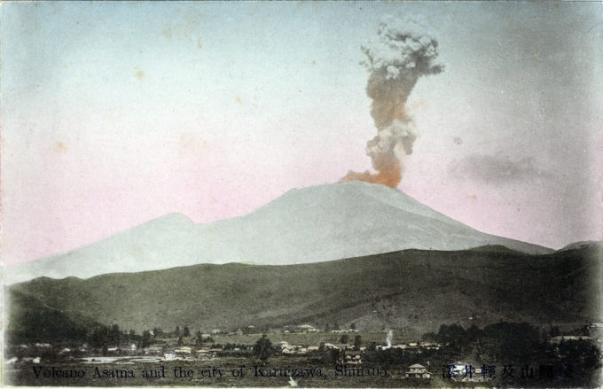 An active Mt. Asama volcano and the nearby town of Karuizawa, c. 1920.