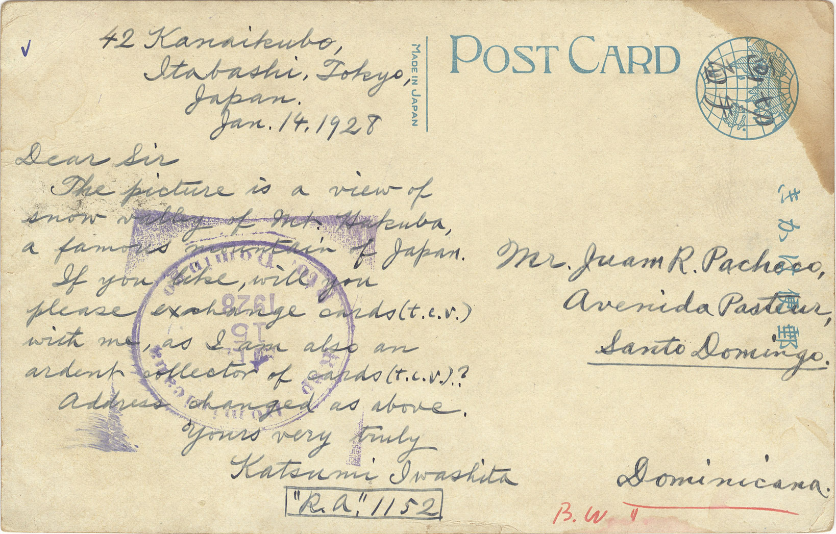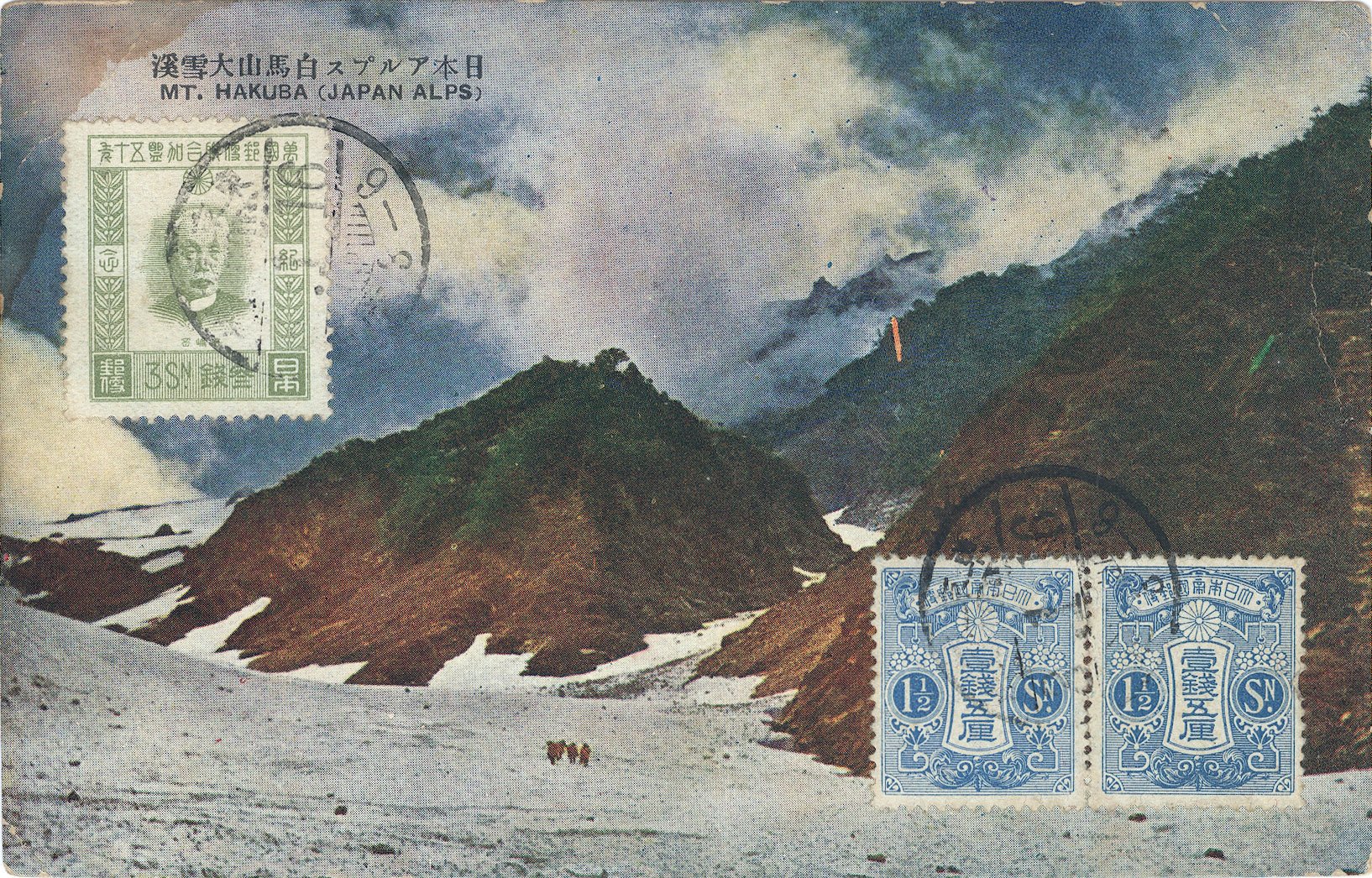“A view of snow valley of Mt. Hakuba, a famous mountain of Japan,” postcard reverse, 1928. Credit is often given to William Gowland (1842-1922) for the creation of the term “Japan Alps”. A Meiji-era mining engineer, who came to Osaka from England to work at the Imperial Mint, Gowland roamed through the Japanese back-country in the late 1870s mainly to survey the country’s mineral resources. In one account, published in 1881, he described the pinnacled ridges of central Honshu as something “that might perhaps be termed the Japanese Alps.”