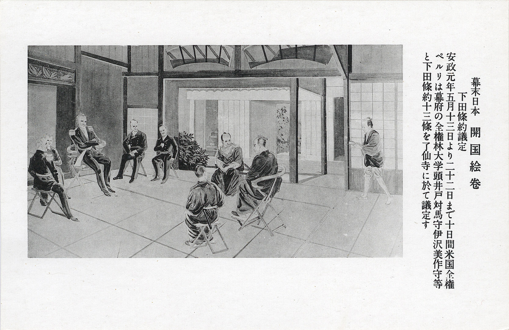 Commodore Perry negotiating at Ryosenji Temple in 1854, Shimoda, commemorative postcard, c. 1930. The caption reads: “In the first year of the Ansei Era [1854], for ten days from May 13 to May 22, the U.S. government’s supreme authority was exercised at Ryosenji temple in Shimoda concerning the 13 articles of the Shimoda Treaty.” The articles of the Shimoda Treaty further supplemented the terms of the Kanagawa Treaty (officially the “Japan–US Treaty of Peace and Amity”) agreed to two months prior, in March 1854, which ended Japan’s self-imposed policy of national seclusion. The Treaty of Shimoda stipulated details for the usage of Shimoda port by Americans, who were now officially allowed to walk freely in Shimoda and officially allowed to communicate with Japanese commoners for the first time in Japanese history. Ryosenji is now memorialized as “the Hall of Opening the Nation.”