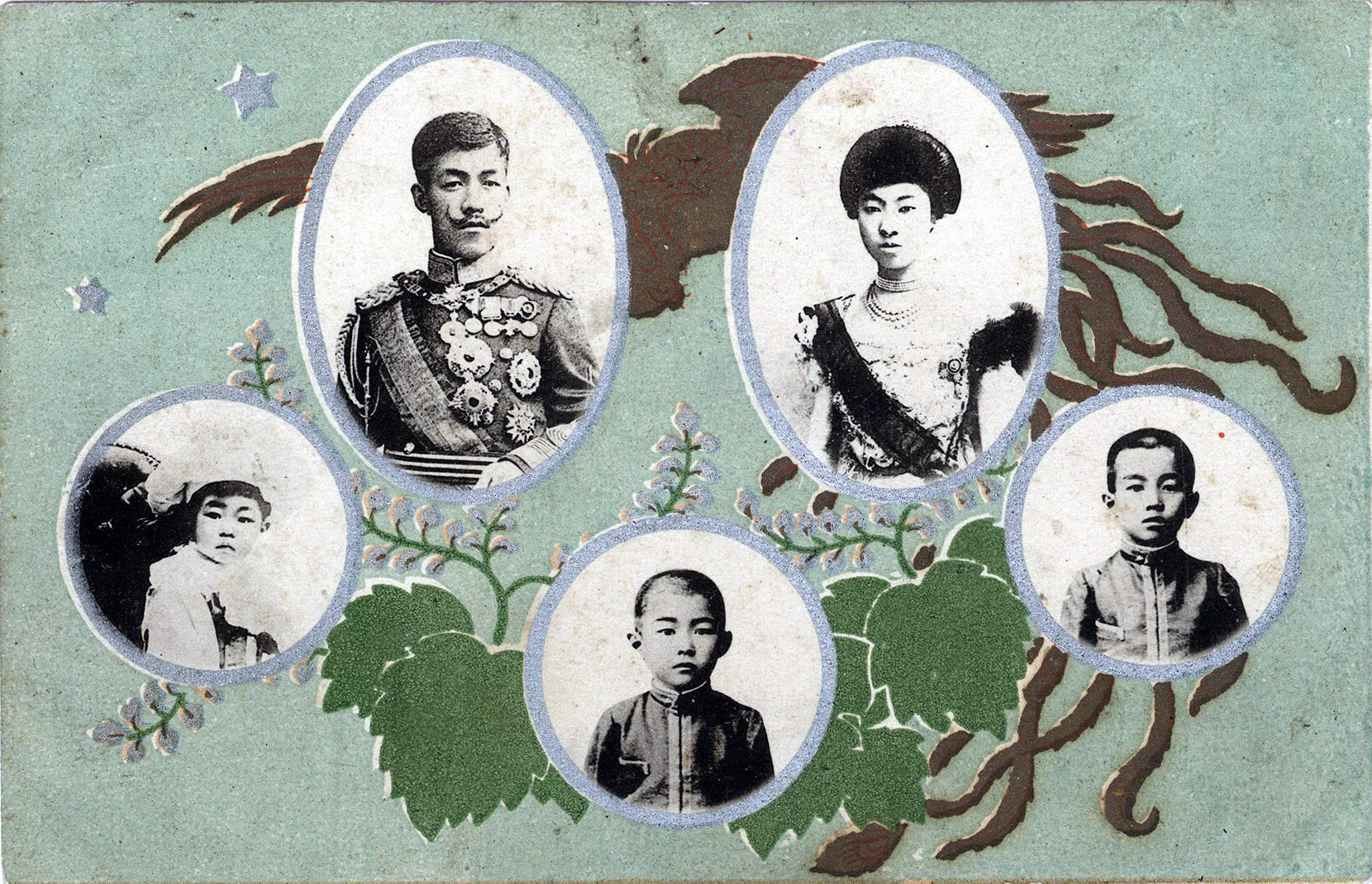 Emperor Taisho and Empress Teimei, 1925. Commemorative postcard for their Silver Wedding Anniversary (1900). Then-Crown Prince Yoshihito married 15-year-old Kujō Sadako in 1900. She had been carefully selected by Emperor Meiji for her intelligence, articulation, and pleasant disposition and dignity – to complement Prince Yoshihito in areas where he was lacking.