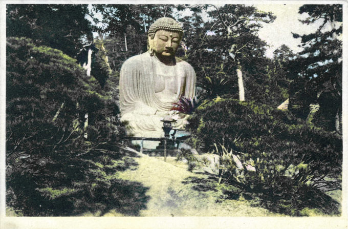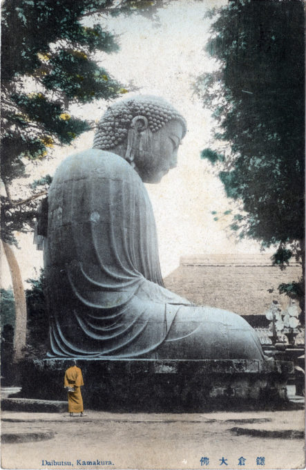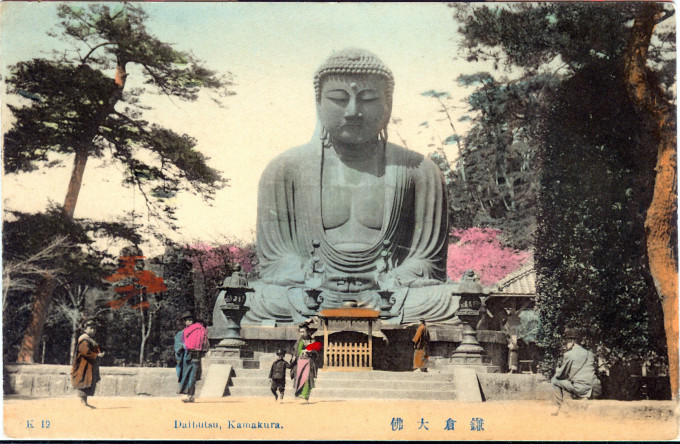 “This huge bronze statue of Amida popularly known as the Great Buddha of Kamakura was made in about 1252. That it is not Rushana (Vairochana Buddha), as is the case of the Daibutsu in Nara, but is the Amitabha Buddha is typical of Kamakura.