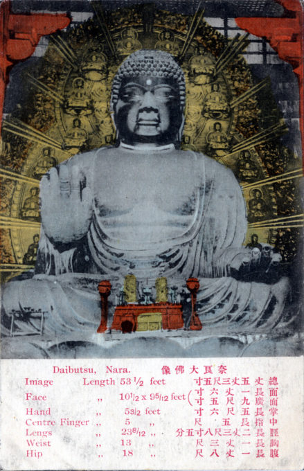 “It was erected in 749 at the instance of the (45th) Emperor Shomu (718-58), and contains 500 lbs. of gold; 16,827 lbs. of tin; 1954 lbs. of mercury; 986,180 lbs. of copper; an unrecorded quantity of lead; and is said to weigh approx. 500 tons. The gold and mercury were used solely for gilding. It is 53-1/2 ft. high; 18 ft. across the breast, with a face 16 by 9-1/2 ft.; mouth and nose, each 3 ft. 9 in. wide; eye, 3 ft. 11 in.; and ear, 8 ft. 6 in. The features are Negroid and suggest Hindu inspiration.