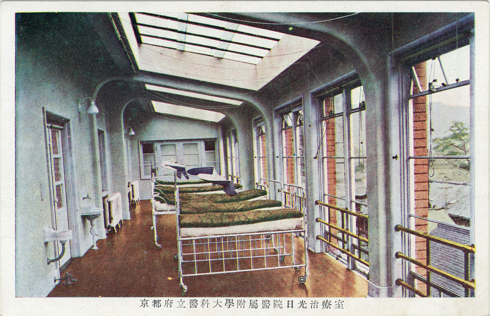 Daylight therapy room, Kyoto Imperial University Hospital, c. 1920. The Kyoto Imperial University College of Medicine established in July 1899, with the university hospital opening in December 1899 (and renamed Kyoto Imperial University Hospital in 1919). Before the invention in the 1940s of medications to control tuberculosis, daylight therapy was used as an effective treatment.