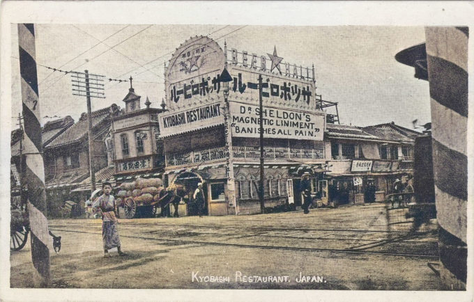 “Dr. Sheldon’s Magnetic Liniment”, Kyobashi Restaurant and Sapporo Beer Hall, Kyobashi, Tokyo, c. 1905. (Colorized)