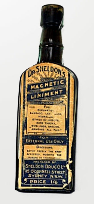 “‘Dr. Sheldon’s Magnetic Liniment’ was a patent medicine produced by the Sheldon Drug Co. of Sydney, Australia. Established in 1904, it was a company of manufacturing chemists who produced numerous cosmetic and toilet preparations.