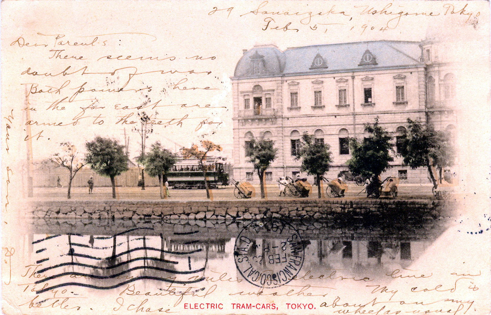 “There are many miles of electric line in Tokyo. Beautiful weather. My cold is better. I chase about on my wheel as usual.