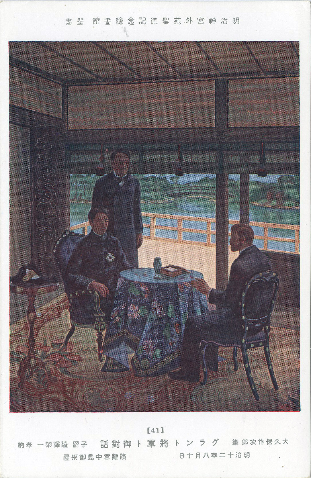 Emperor Meiji meets former U.S. President Grant, 1879. The image is a reproduction of one in a series of paintings depicting the life, death and historic reign of Emperor Meiji that are on display at the Meiji Shrine Memorial Picture Gallery.