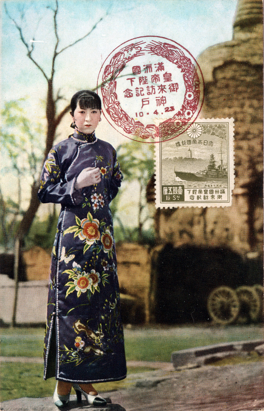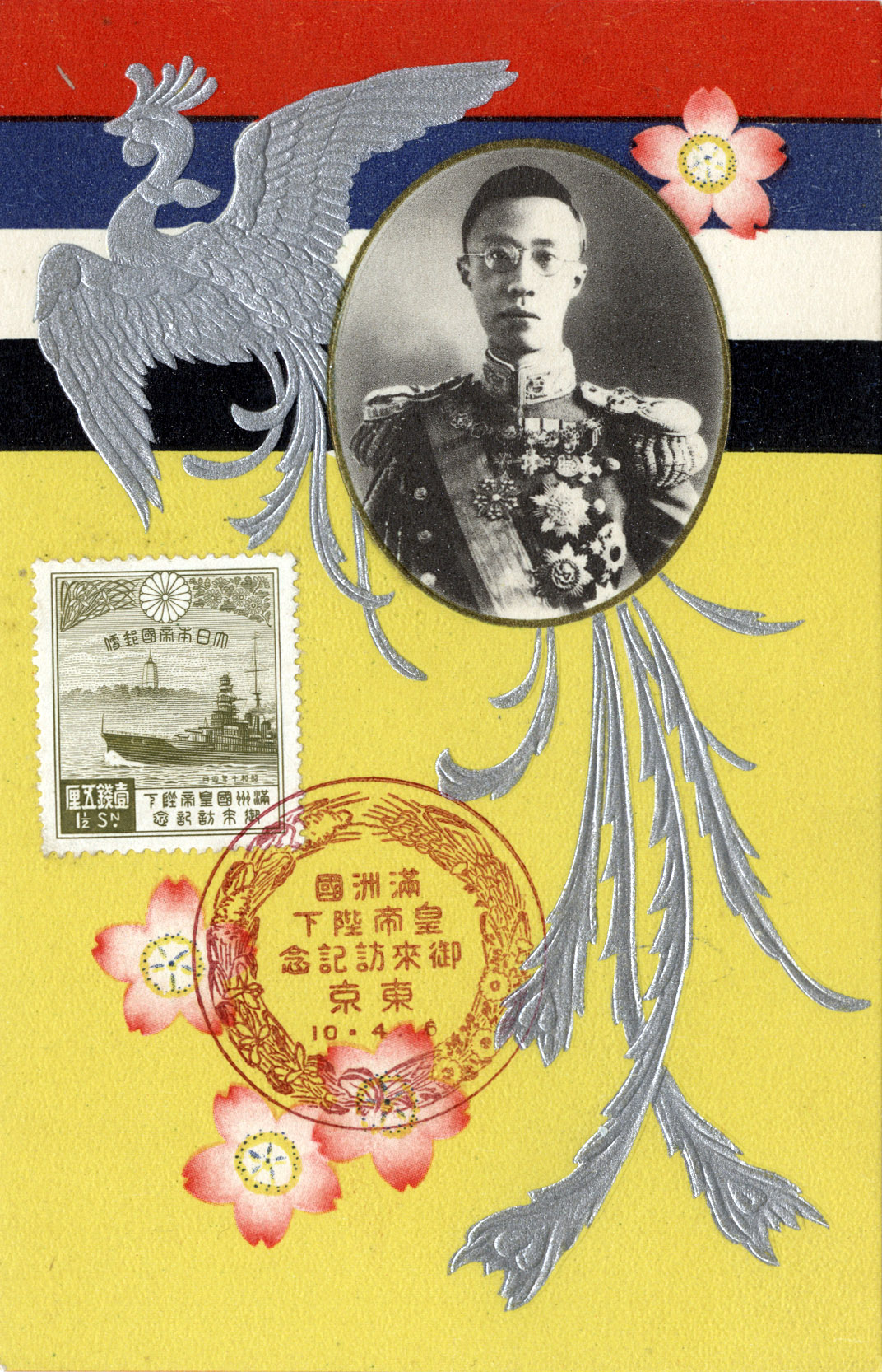 A commemorative postcard issued in 1935 (Showa 10) on the occasion of the state visit to Japan of Henry Pu Yi, Emperor of Manchukuo, in April, 1935. Affixed is a 1-1/2 sen stamp bearing the image of Emperor Showa’s (Hirohito) personal flagship Hiei, which conveyed Emperor Pu Yi from Manchukuo to Japan for his state visit.