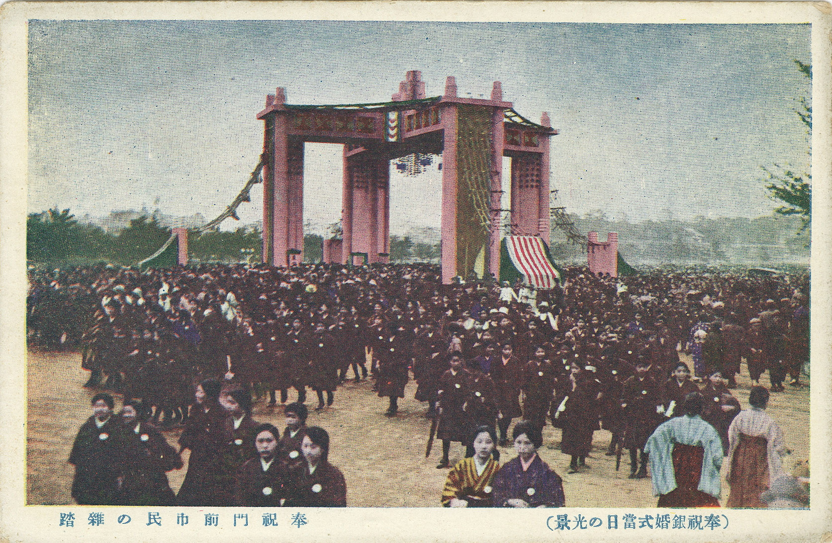 - Crowds gather under a memorial arch erected in front of the Imperial Palace’s Hoshimon gate in observance of Emperor Taisho’s Silver Wedding Anniversary, 1925.