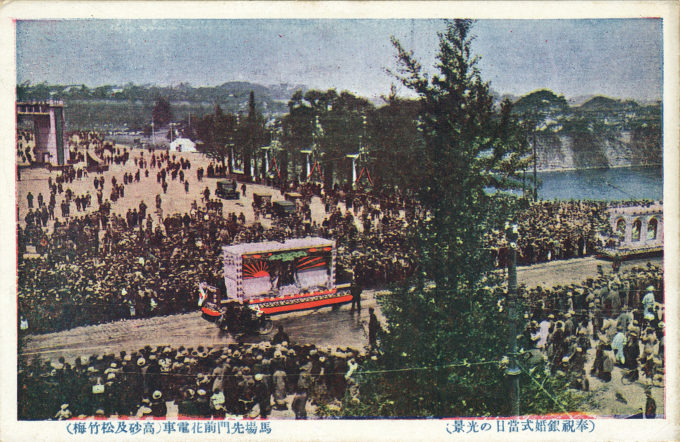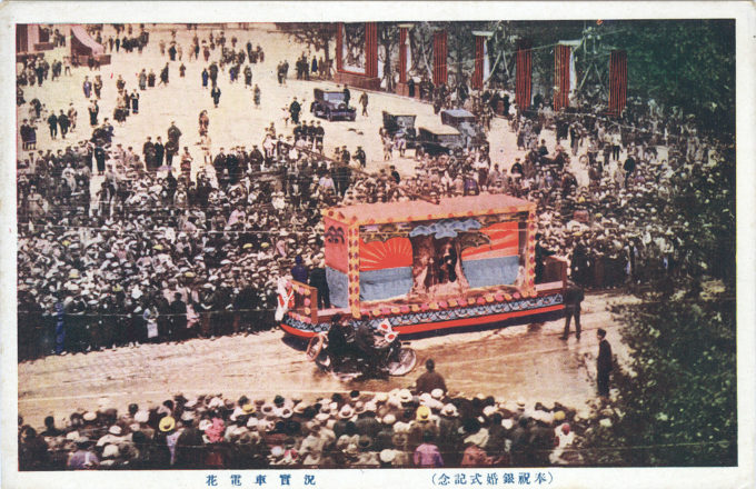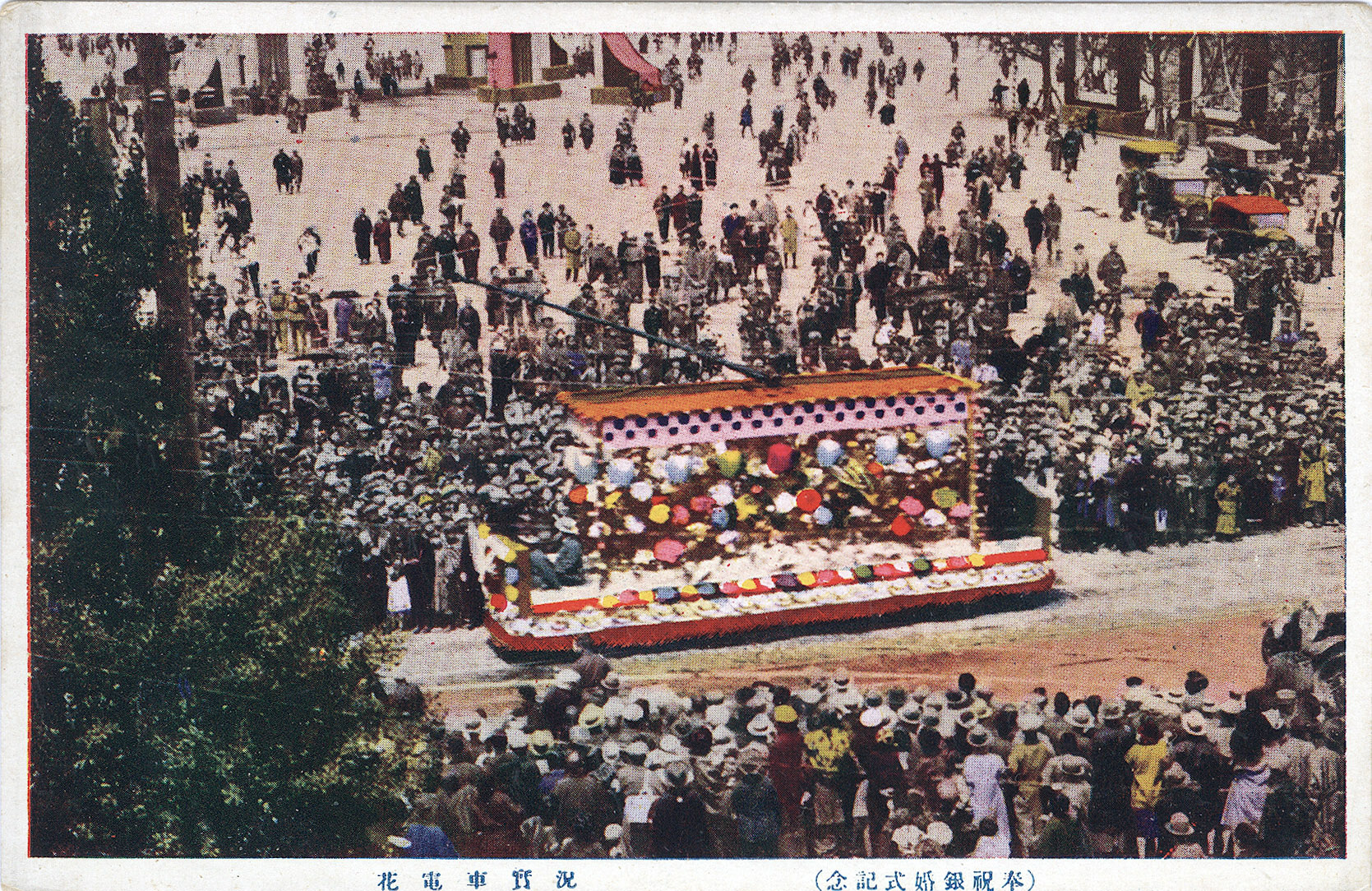 - Parade of flower tram floats across the Imperial Palace plaza, Emperor Taisho 25th Wedding Anniversary, Tokyo, 1925.