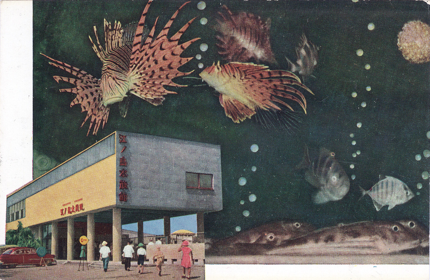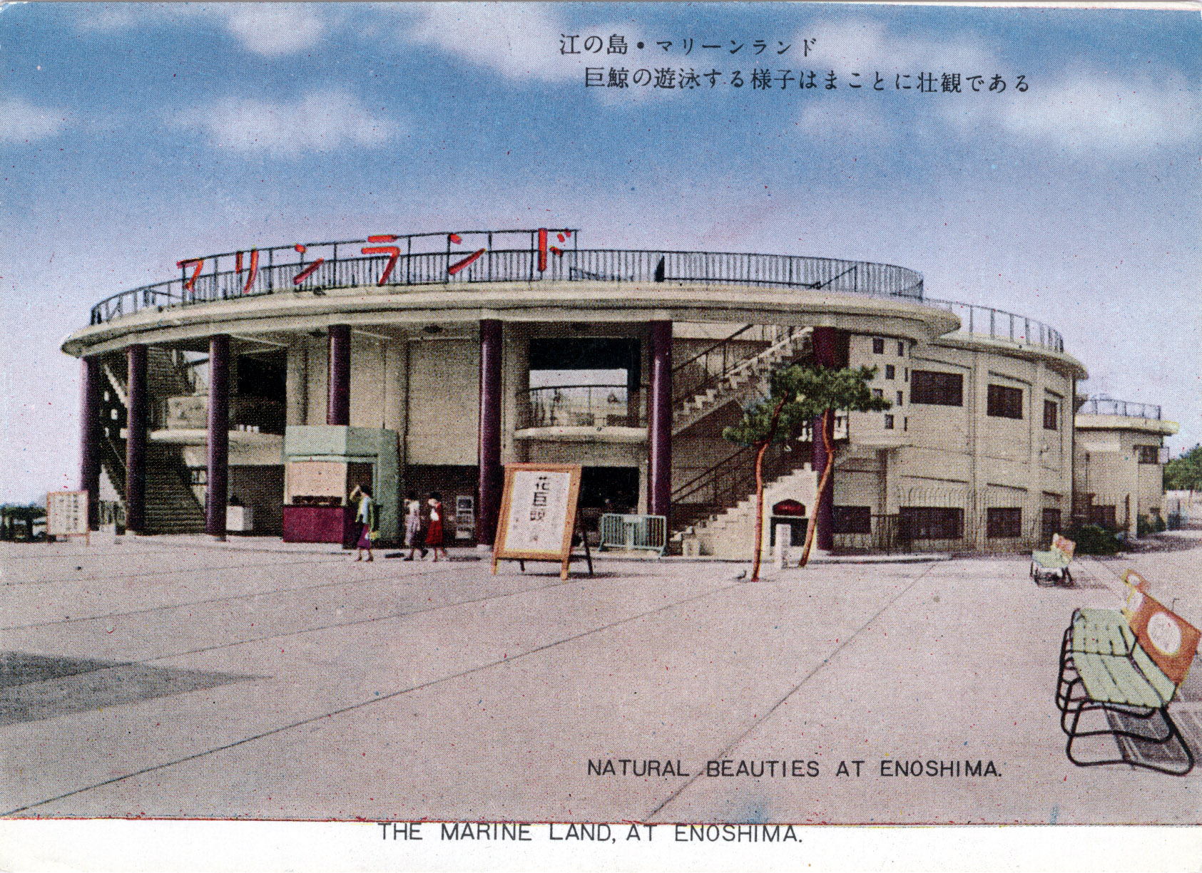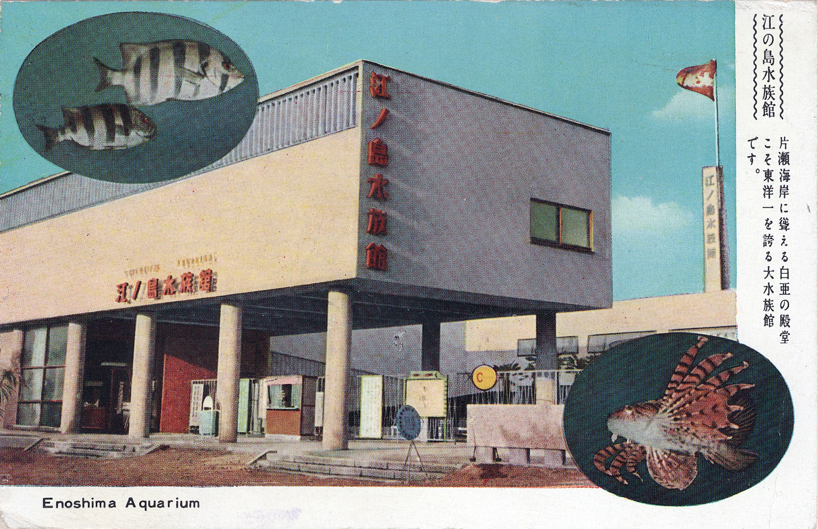Enoshima Aquarium, c. 1965. The caption reads: “The white hall of the aquarium, which rises on the Katase coast, is the largest aquarium in the East.”