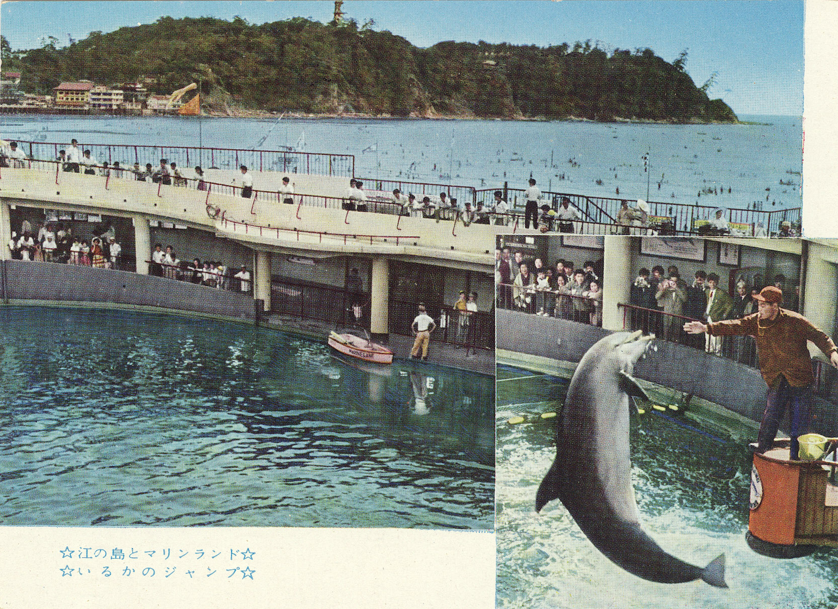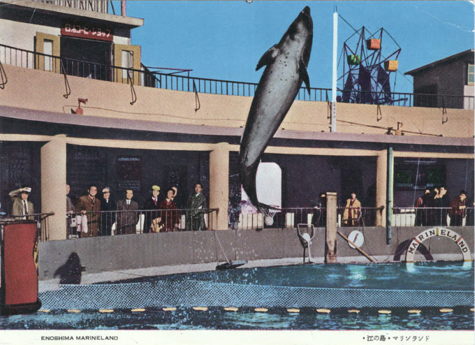 But, the biggest tank of all was at Enoshima Marineland in Japan. It opened ca. 1965 with a tank nearly the size of a football field – measuring 200 ft. long by 100 ft. wide and 28 ft. deep – a capacity of over 4,000,000 gallons! It was built mostly in-ground to prevent it from bowing in the center. Some time in the 1970s, the original tank was demolished and replaced with a newer amphitheater-style pool.