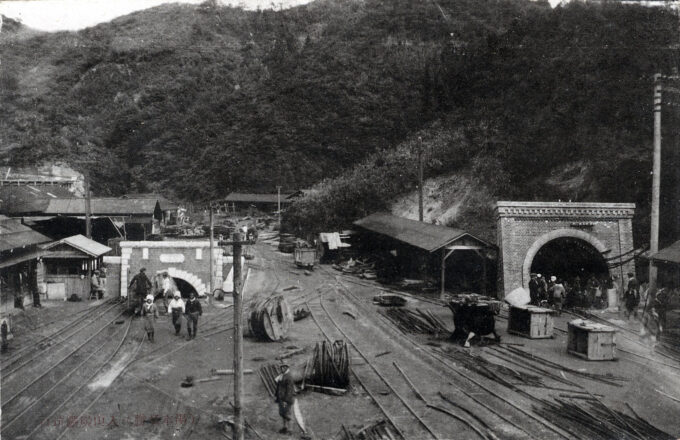 Entrance to the Inyama Mine, Joban Coal Field, Fukushima, c. 1920. Mining the Joban coal field was a major source of coal production in Japan during the first half of the 20th century. The south field was opened for mining in 1851; the north field opened in 1855. in 1883, the Iwaki Coal Mining Company was established by prominent Meiji era business giants, including Eiichi Shibusawa, Sōichirō Asano, and Kihachirō Ōkura, among others — marking the beginning of the field’s modern industrial exploitation.