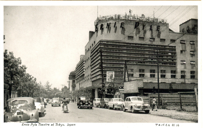 The Takarazuka Theater, at Yurakucho, was requisitioned by Occupation forces from 1945-1952 for use as a movie and stage theater for Allied military personnel. During this time it was renamed the “Ernie Pyle” theater, after the beloved American journalist killed in 1945 on Ie Shima while covering the Okinawa campaign for Scripps-Howard newspapers.