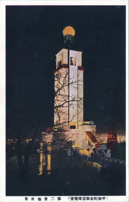 “Night view of the Peace Tower in the 2nd Section”, Peace Commemorative Exposition, Ueno Park, Tokyo, 1922.