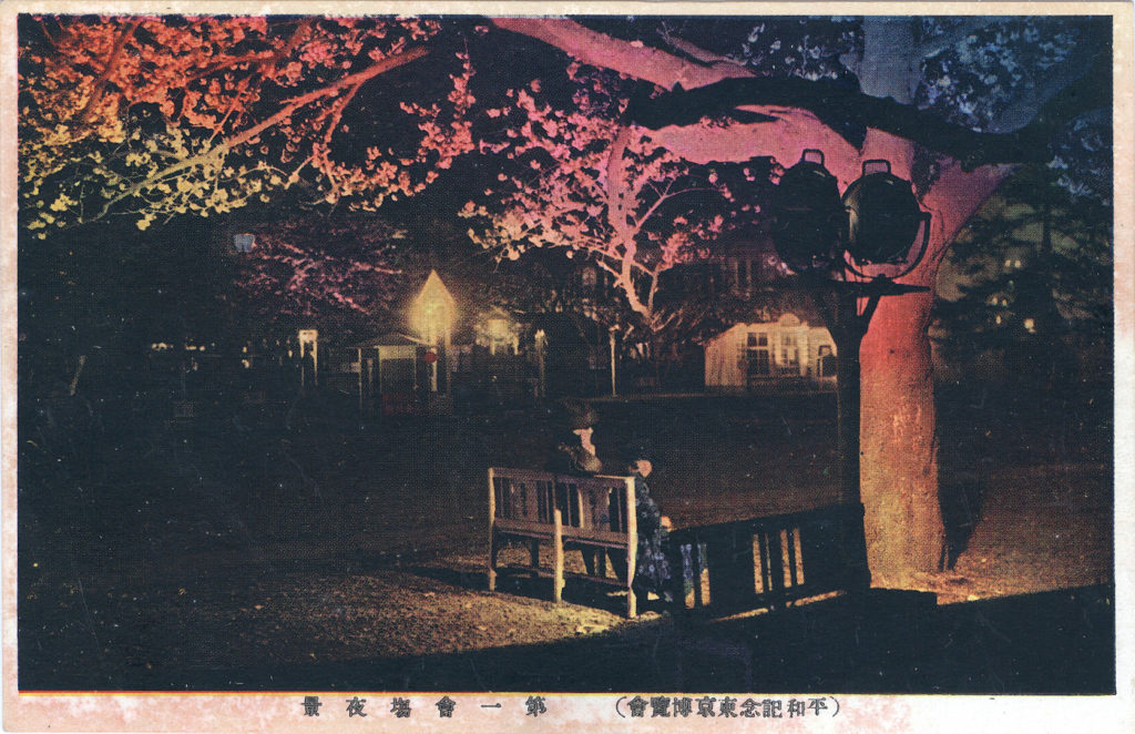 - The Peace Hall illuminated in the evening. Peace Commemorative Exposition, Ueno Park, Tokyo, 1922.