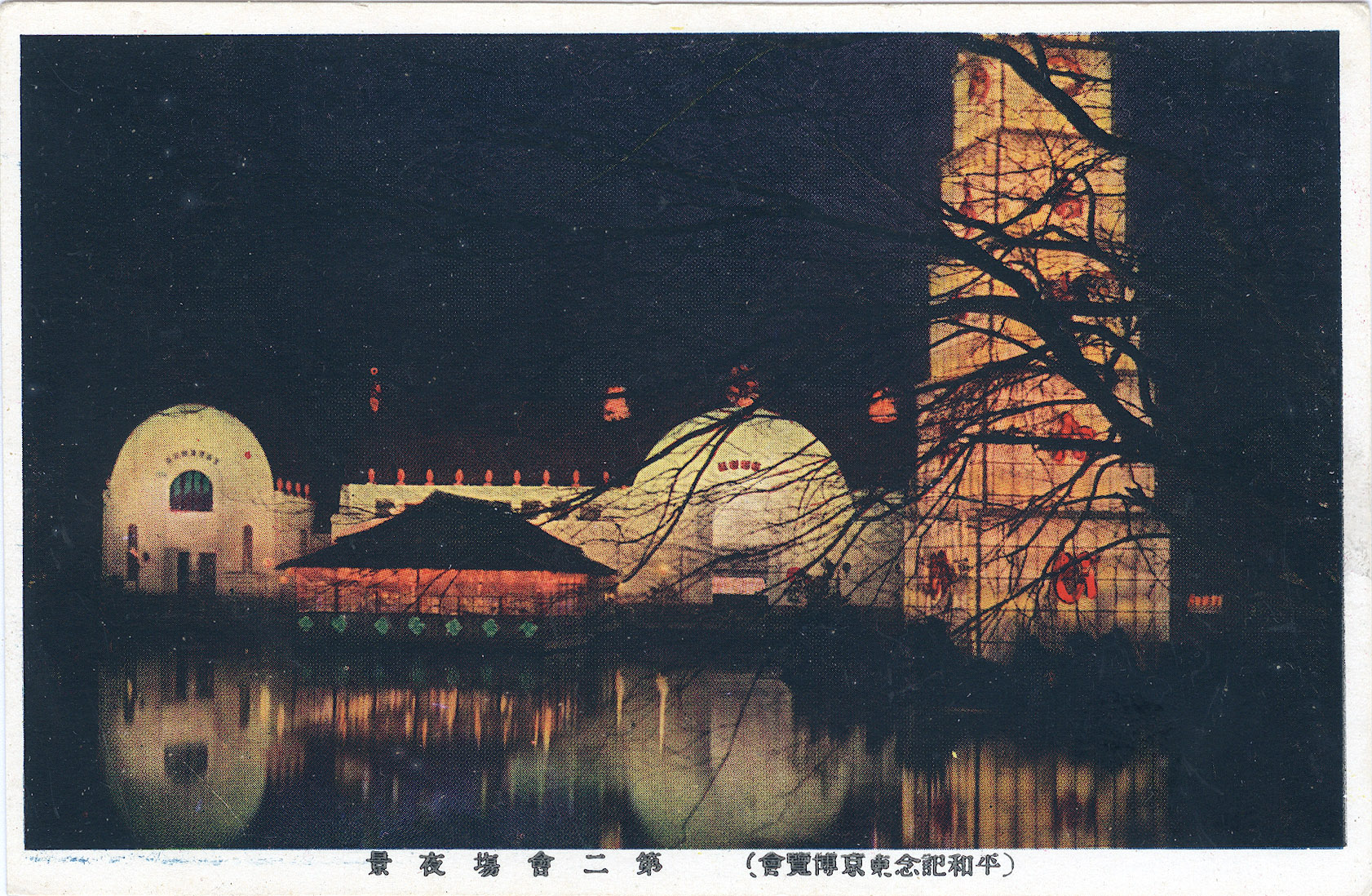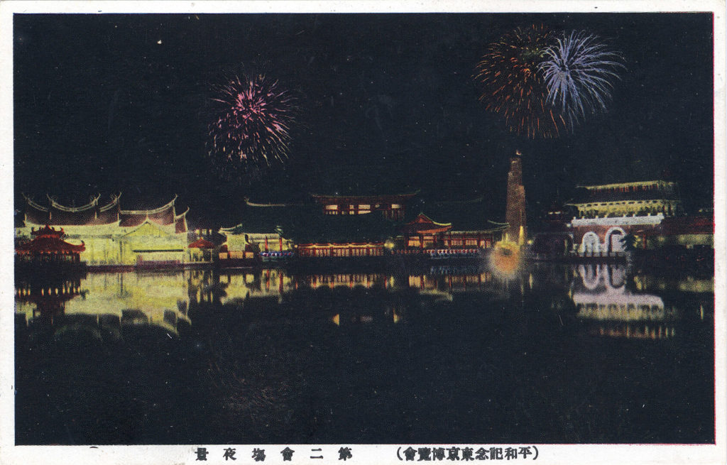- Peace Commemorative Exposition, Ueno Park, Tokyo, 1922. Fireworks and searchlights illuminate the Peace Tower and Hokkaido Pavilion in the 2nd Section.