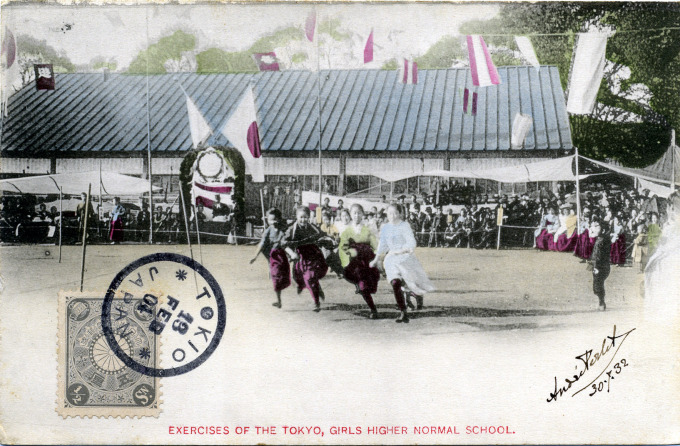 Sports days [undoukai] are still ubiquitous at all levels of Japanese education, and last all day. Some schools take them more seriously than others. This postcard image, postmarked 1904, shows girls in a race around the athletic field at the Tokyo Girls Higher Normal School, near Ueno Park, Tokyo — one of only two higher normal schools for girls in Japan (the other was located at Hiroshima) during the Meiji Era (1867-1912).