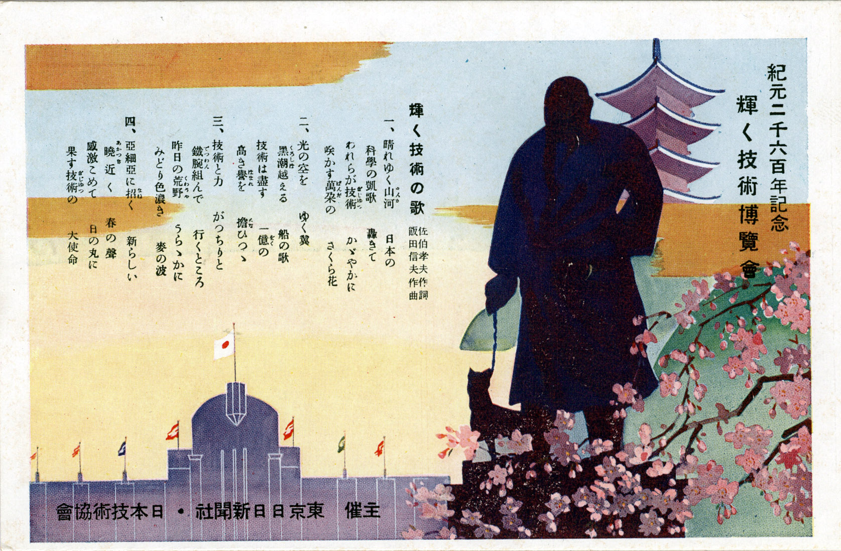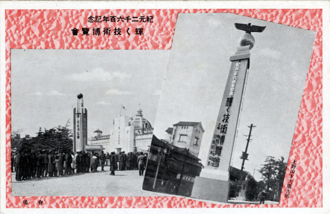 Exposition of Shining Technology, 1940. Exposition pavilion and silhouette of Saigo Takamori statue at Ueno Park.