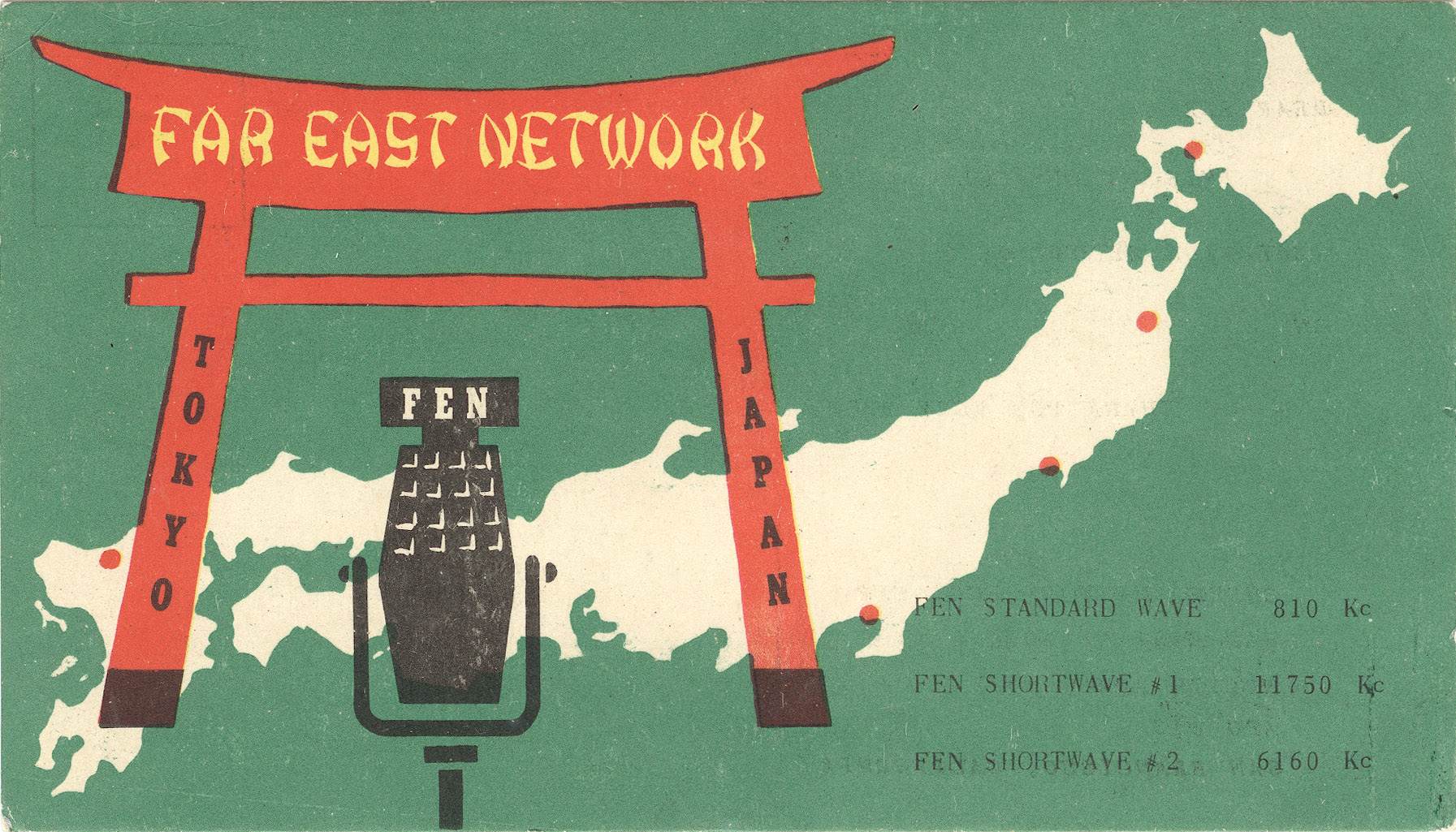 “8-10 On Your Dial, Far East Network, Tokyo.” Far East Network QSL postcard displaying the locations of the five main networked AFRS stations in Japan, c. 1955: Sapporo, Hachinohe, Sendai, Tokyo (where operations were headquartered), and Fukuoka. A “QSL” card is written confirmation of receiving the signal of a distant broadcasting station from outside its usual signal contour, e.g. the reception of a Japanese AM radio signal by a listener within the Continental United States. Upon receiving a notification of a reception, a radio station engineer would confirm the day, the time, the broadcast frequency, and (sometimes) the program content for the benefit of the hobbyist DX listener by returning to them a “QSL” card. (“QSL” was derived from the Q code for a statement or a question – in this case “I confirm receipt of your reception”)