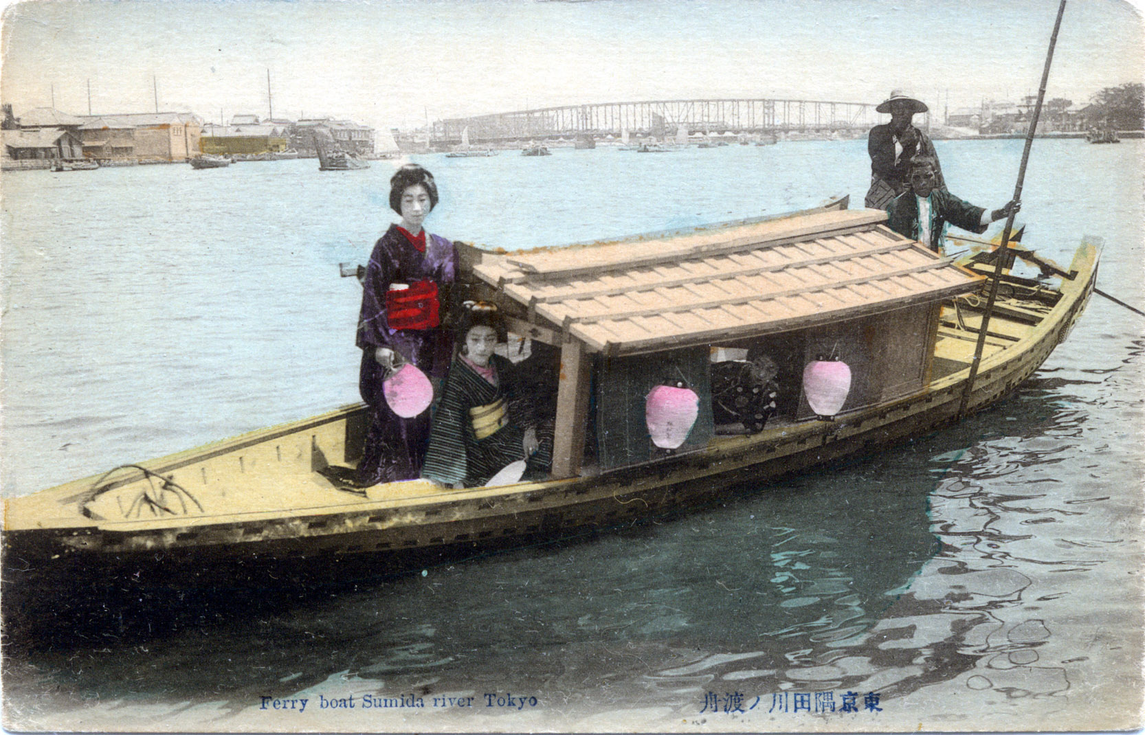 Geisha are carried across the Sumida River aboard a yane-bune, a canopied boat that ferried passengers across the river (also called a chochin-bune, lantern boat). In the distance is Shin-o-hashi [new great bridge], an steel truss span erected in 1911 across the Sumida that replaced a Edo era wooden span last constructed in 1885.