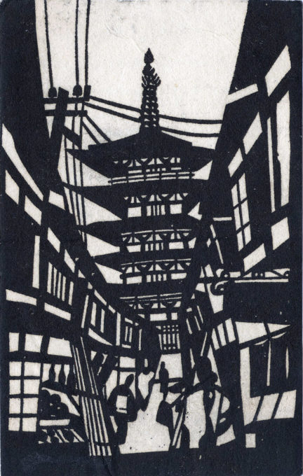 An artistic rendition of the five-storied pagoda Yasaka Pagoda (aka “Tower of Yasaka”), Kyoto, c. 1950. This postcard-size print is a “key block” impression (the block from which the process of color print making begins, as a guide for the disposition of any other colors to be added) by woodblock artist Nenjiro Inagaki (1902-1963), also known as Toshijiro Inagaki, known primarily for designing textiles but who also became an important figure in the sōsaku-hanga (literally “creative prints”) movement of post-war years in Japan of which this is an example.
