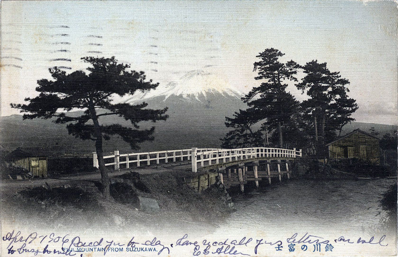 “Fuji mountain from Suzukawa”, 1906. Suzukawa was located along the Tokaido, in the Yoshiwara district of Shizukoka Prefecture, which connected the imperial capital at Kyoto with the bakufu administrative capital at Edo during the Tokugawa era. This section of the Tokaido was lined with pine trees running through rice fields (as depicted in a Hiroshige ukiyo-e), giving definition not only to the roadway but also providing shade and shelter for travelers.