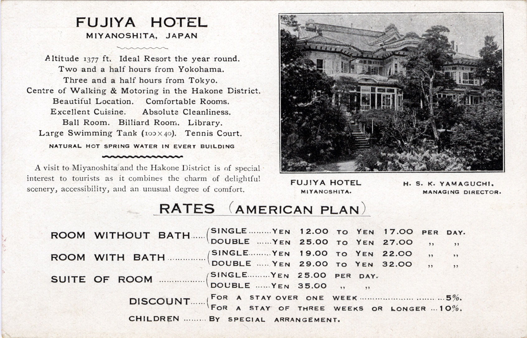“Foreign visitors cannot do better than make the Fujiya Hotel their headquarters when visiting the Hakone district, since they will thus secure every comfort and be in the best position to see all places of interest.