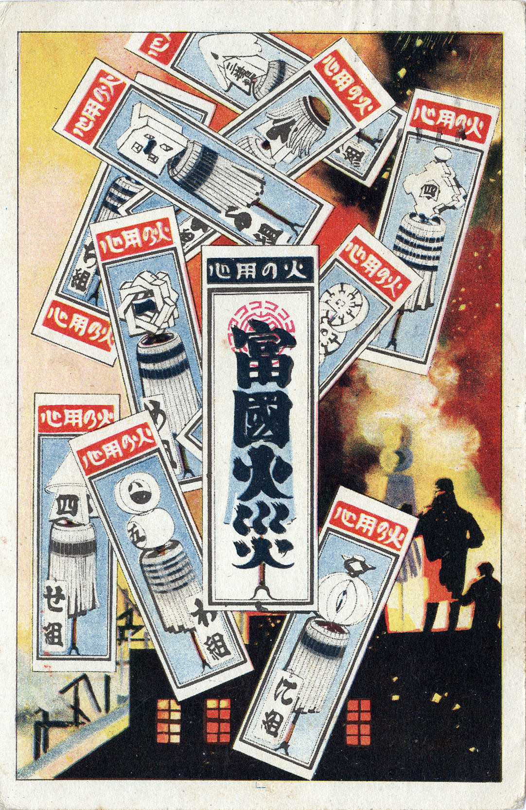 Fukoku Fire & Marine Insurance Co., Ltd. advertising postcard, Tokyo, c. 1930, had its beginnings in 1897 as the Otaru Cargo Insurance Co. Expanding beyond its cargo insurance limitations, the company received approval in 1919 to solicit general commercial insurance coverage concerns. In 1922, Otaru Cargo Insurance Co. changed its name to Fukoku Fire & Marine Insurance Co., Ltd. Fukoku Fire & Marine was then merged in 1944 with Okura Fire & Marine Insurance and in 1946 with Chiyoda Fire & Marine Insurance.