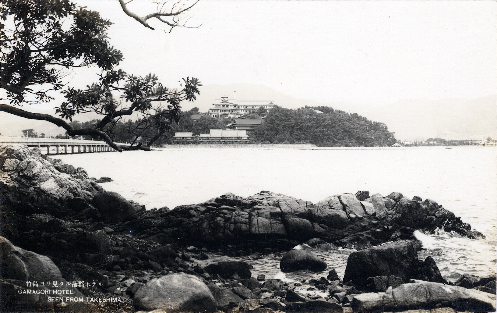 “… [T]his distinguished and pretty hotel stood three floors high and was roofed with sparkling green tiles. Their front-facing rooms overlooked the calm Mikawa Bay with superb views of Takeshima Island, the Yaotomi Shrine and other small islands. Members of the Japanese royal family were among the guests who had stayed over the years. Rooms cost ¥900-¥7,000 without a meal, and the hotel boasted a golf course and a table tennis room.