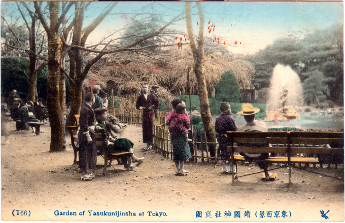 “This Japanese style strolling garden, the Shinchi Teien [sacred pond garden], was created in the early Meiji Era on the grounds of Yasukuni Shrine behind the main shrine building. Its current centerpiece is a small waterfall located in a serene pond, refurbished in 1999.”