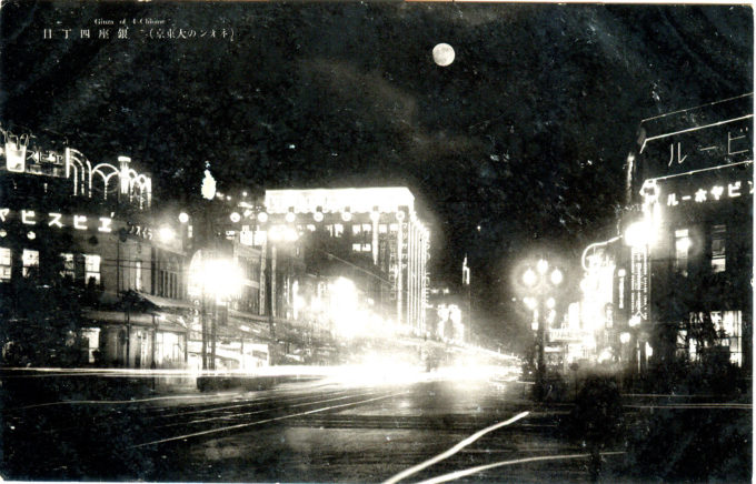Ginza at night under a near-full moon, looking toward Ginza Crossing, c. 1935. At center, draped in neon, is Matsuzakaya department store. Ginza-dori is by flanked beer halls. To the left is Yebisu Beer Hall, one of the oldest beer halls in Tokyo (1899), and to its immediate right is Lion Beer Hall, with its gorgeous Art Deco and Gothic interior, that first opened in 1934.