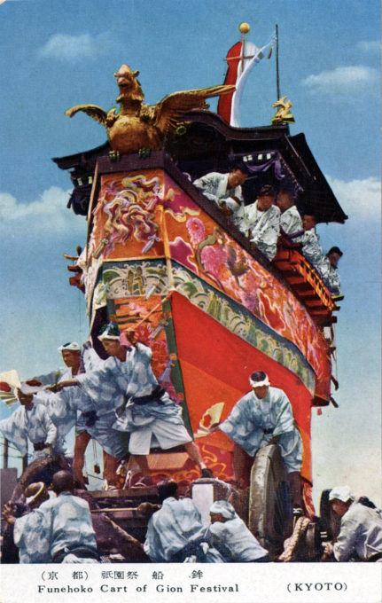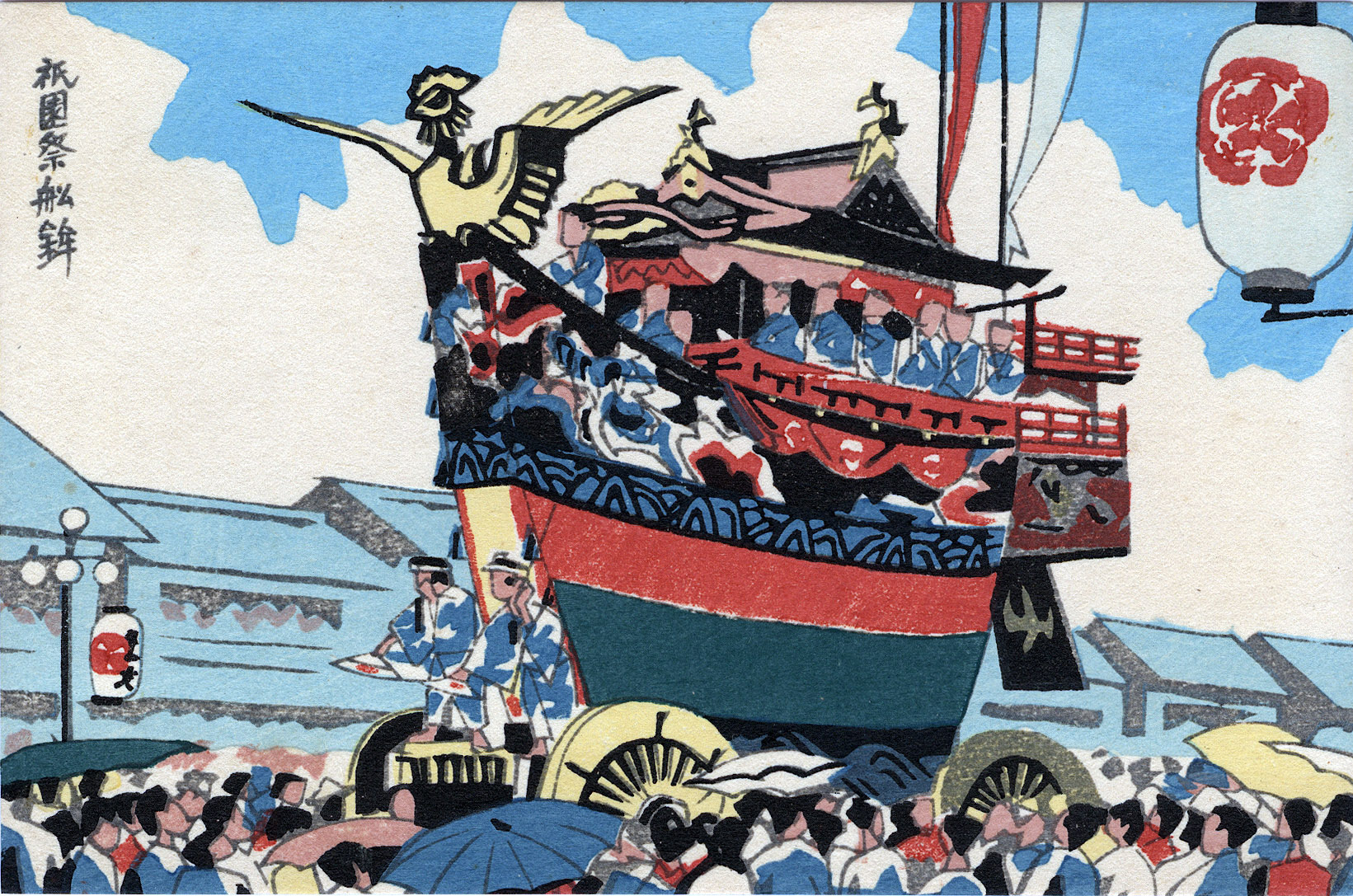 “The Funehoko Cart of Gion Festival”, Kyoto, c. 1960, is unique among the floats as it is shaped like a boat (fune). The floats in the parade are divided into two groups, Hoko and Yama. There are 9 of the larger Hoko (long pole or halberd) which represent the 66 spears used in the original purification ritual.