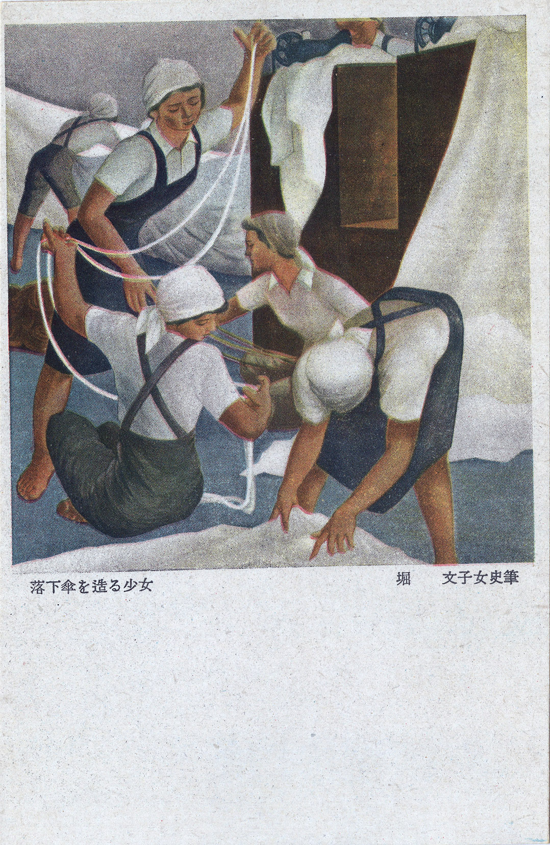 “Girls manufacturing parachutes”, propaganda postcard, c. 1945. Silk manufacturing in Japan had expanded rapidly during the Meiji Era but, primarily because of the creation of man-made fabrics (principally rayon), experienced an equally dramatic decline in the Taisho and early Showa periods. Then, a US embargo in 1940, imposed because of Japan’s 1937 invasion of China, effectively eliminated Japan’s overseas market for silk. With the onset of the Pacific War, when the large-scale production of parachutes for the Imperial army and navy spurred a rapid increased demand for silk, wartime labor shortages soon brought millions more women into the Japanese work force than in any prior period since the Meiji Restoraton.
