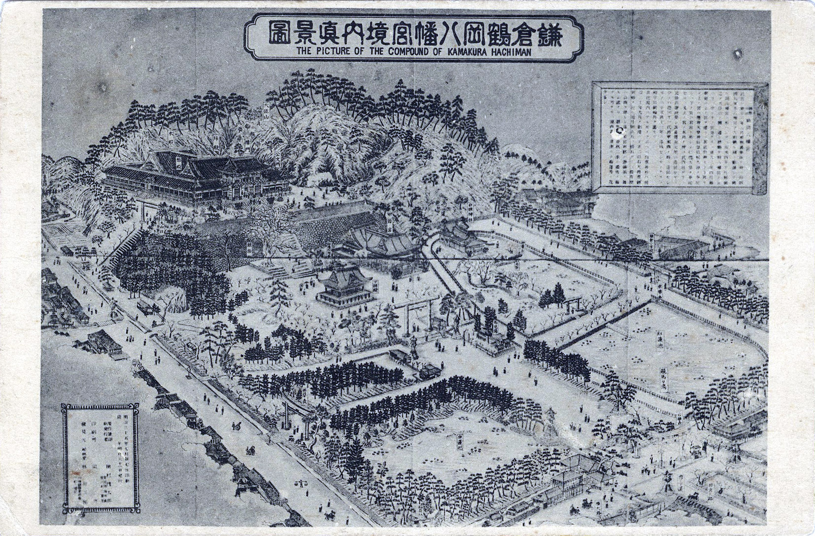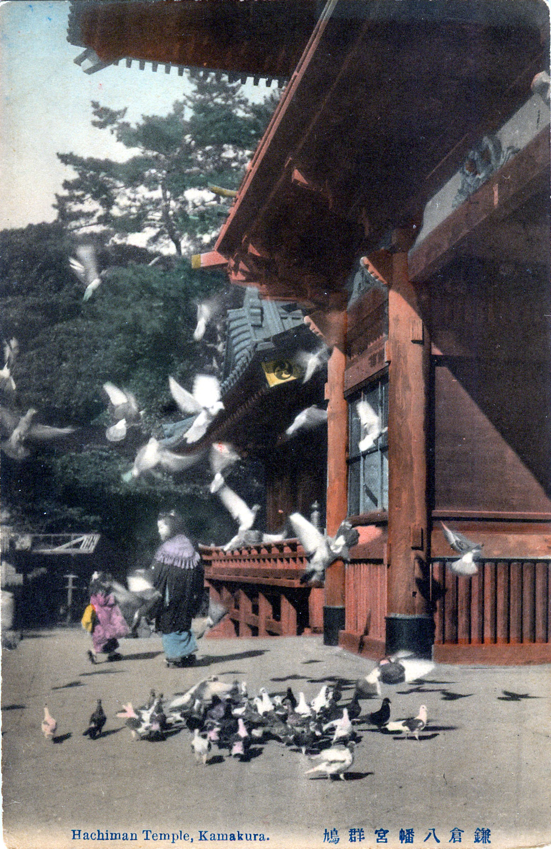 “The Temple of Hachiman, the God of War, dating from the end of the 12th century, stands in a commanding position on a hill called Tsuru-ga-oka, and is approached by a stately avenue of pine-trees leading up the whole way from the sea-shore.