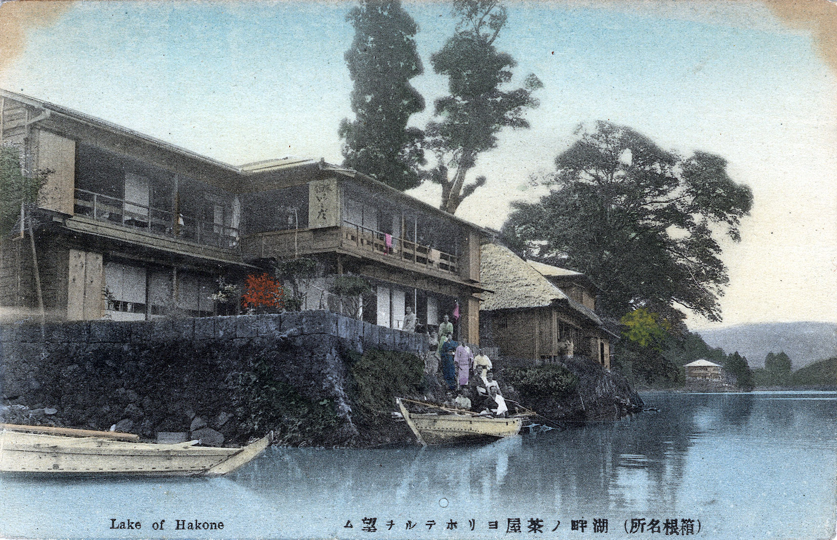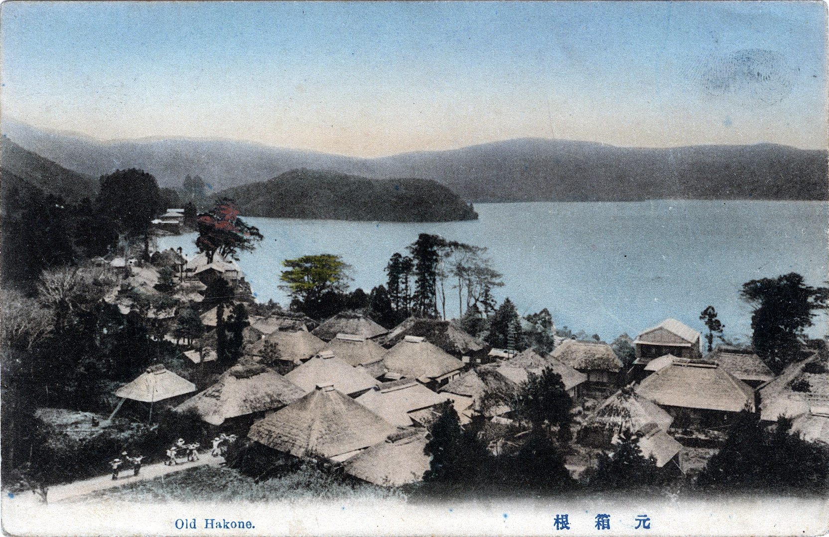 Old Hakone, c. 1910, on the southeast shore of Ashinoko (Lake Ashi, aka Lake Hakone). Hakone was once an important post station on the Tokaido, the site of a major barrier and official checkpoint at the passage known as the ‘Hakone Checkpoint’. Its importance rapidly declined with the fall of the Tokugawa bakufu in 1868 but the area saw a revival as a summer resort and hot springs (onsen) destination when “discovered” by foreign traders and missionaries in the late 19th century and the establishment of an imperial villa (now a public park) at Hakone in 1886.