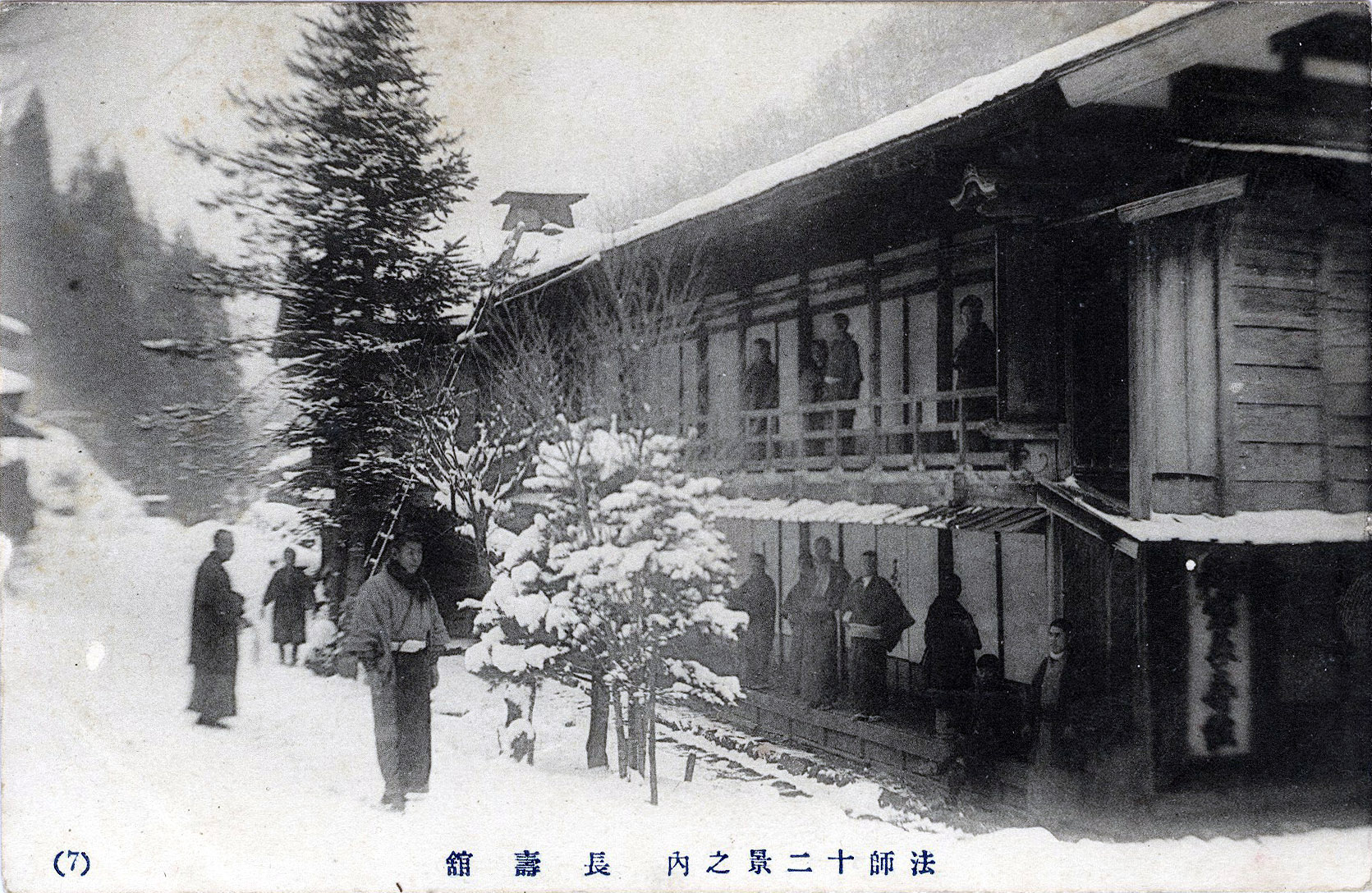 “Hall of Long Life”, Hoshi Onsen Chōjukan, Minakami-machi, Gunma Prefecture, c. 1920. Guests of the inn pose outdoors of the 150-year-old onsen ryokan [hot spring inn], enjoying the winter mountain air after soaking in one of the four onsen the famous inn provides.