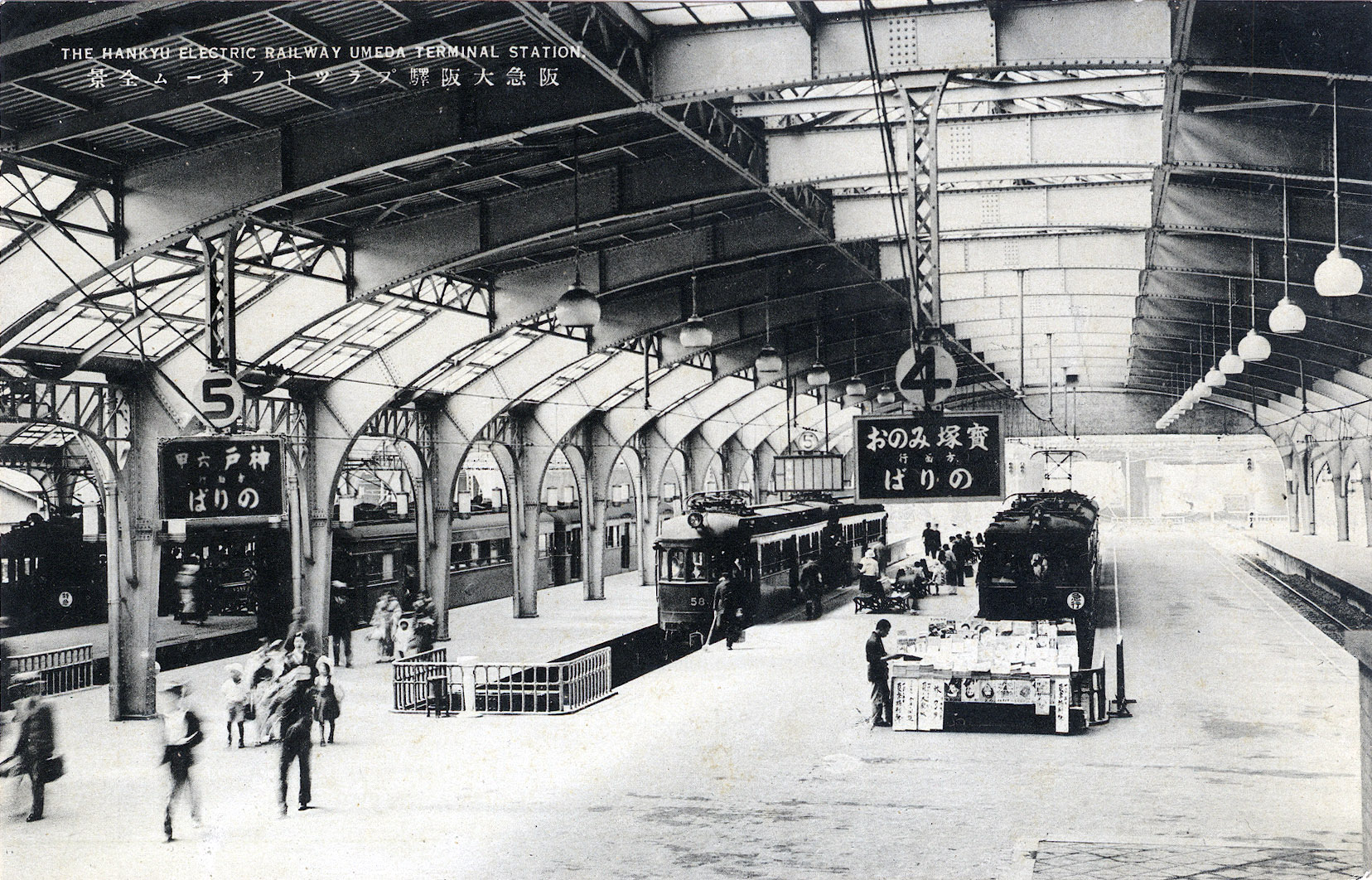 “The Hankyu railway served this recreational empire from a terminal in Osaka at Umeda. The Osaka-Umeda station first opened on March 10, 1910 as a ground-level station.”