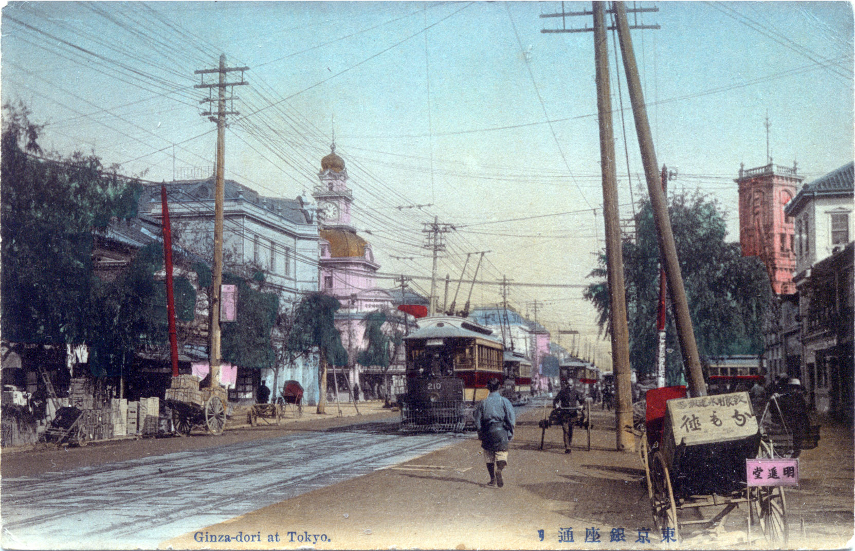 Ginza Crossing, c. 1910, looking west down Harumi-dori toward the Imperial Palace. The Hattori clock tower was the district’s most prominent landmark.