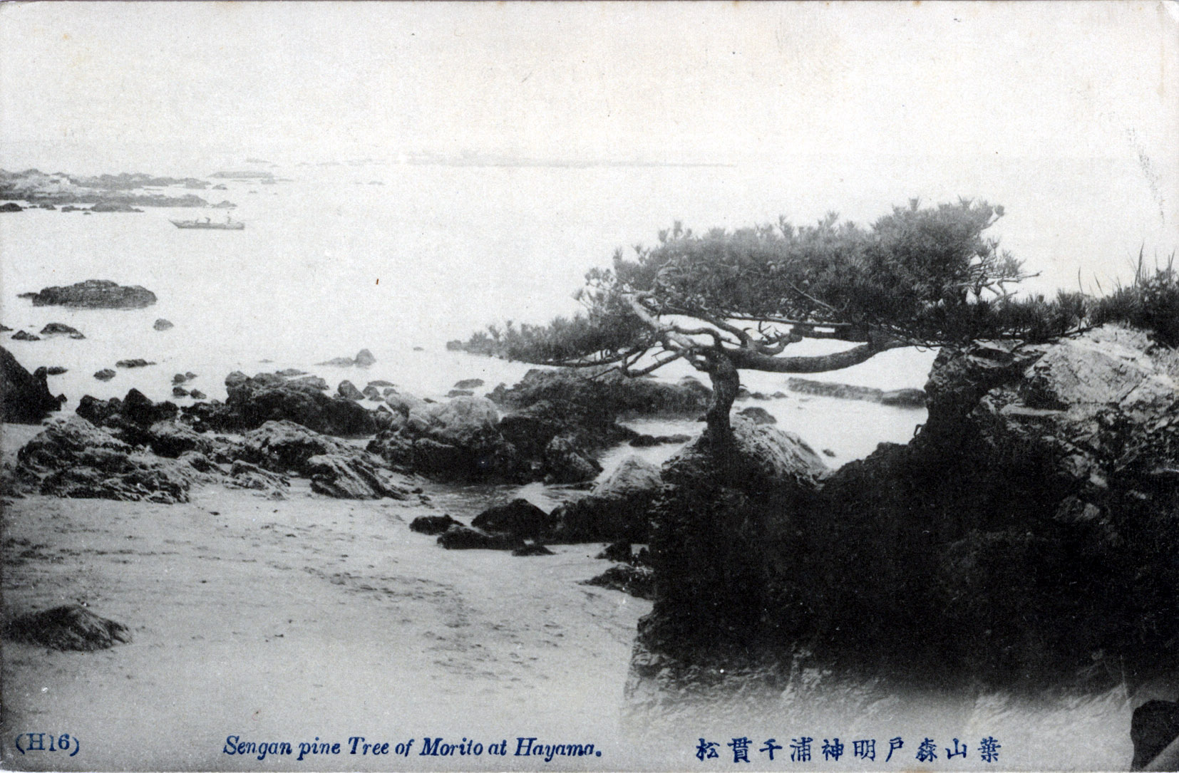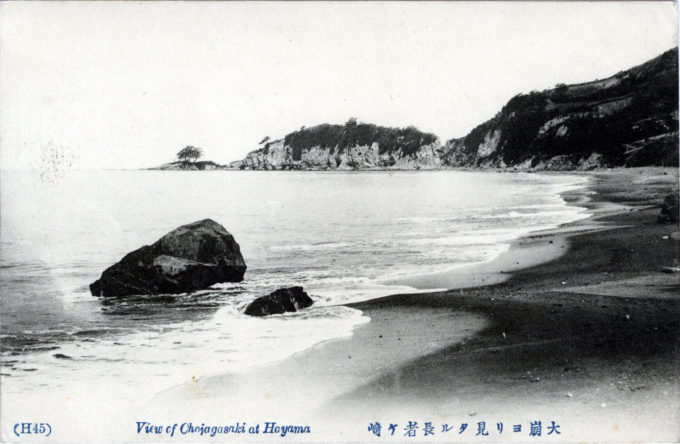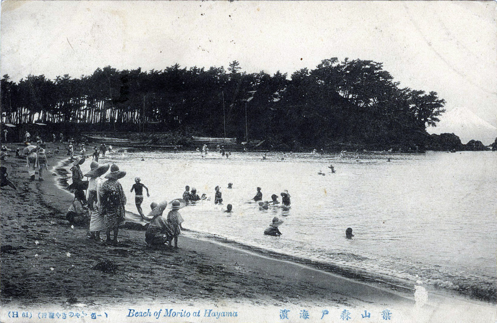 “Hayama, 3.7 m. S. of Zushi, projects further into the bay and commands a better view of Enoshima and Mt. Fuji than does Zushi. Many noted persons have estates in the vicinity. At Ohojagasaki, a pine-clad point to the S., there are good bathing accommodations at a Japanese inn.”