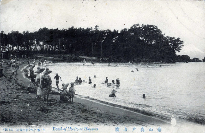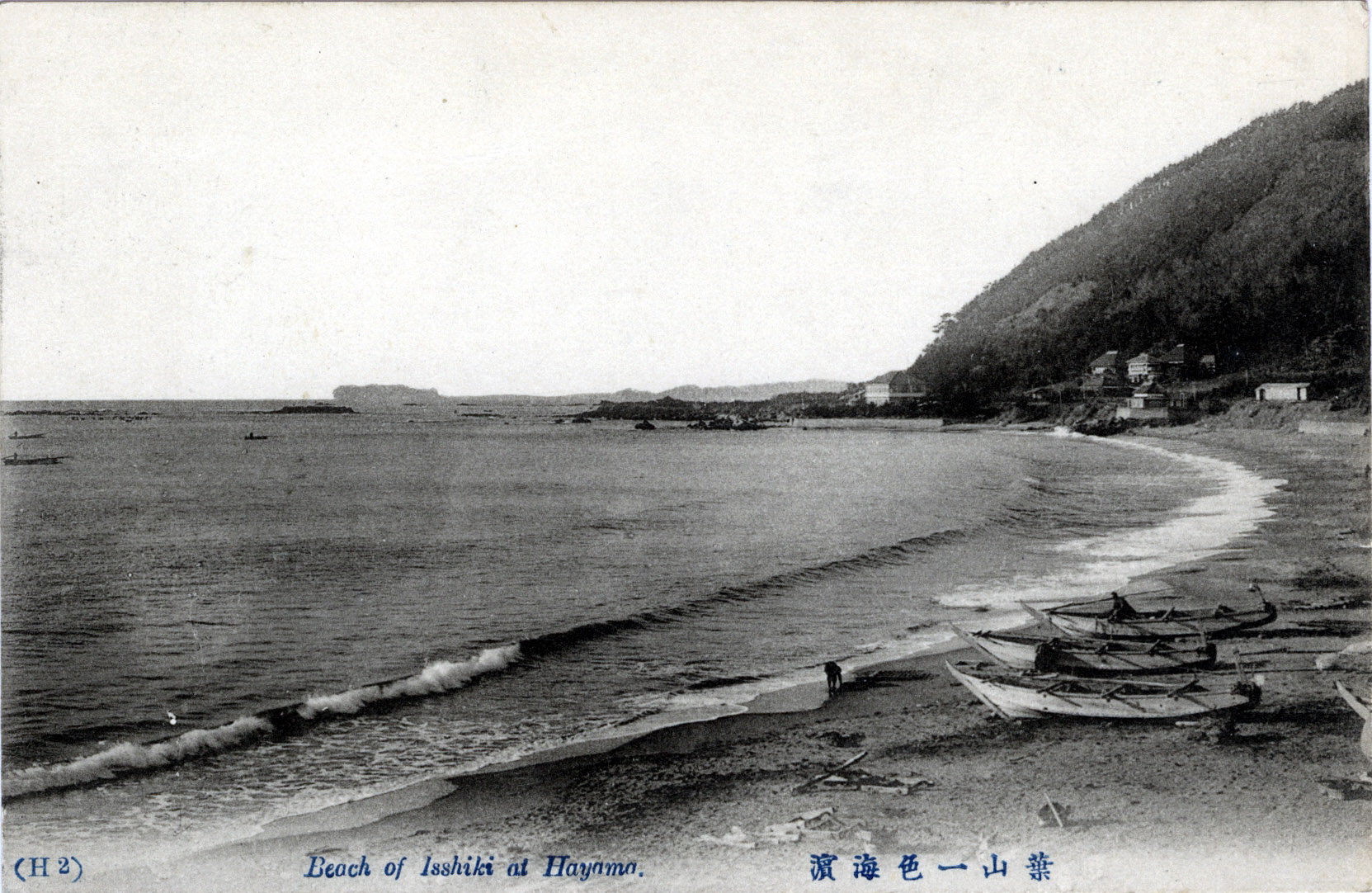 “Beach of Isshiki at Hayama”, c. 1920. In the distance can be seen Enoshima. Hayama is located at the northernwestern end of Miura Peninsula, facing Sagami Bay on the Pacific Ocean.