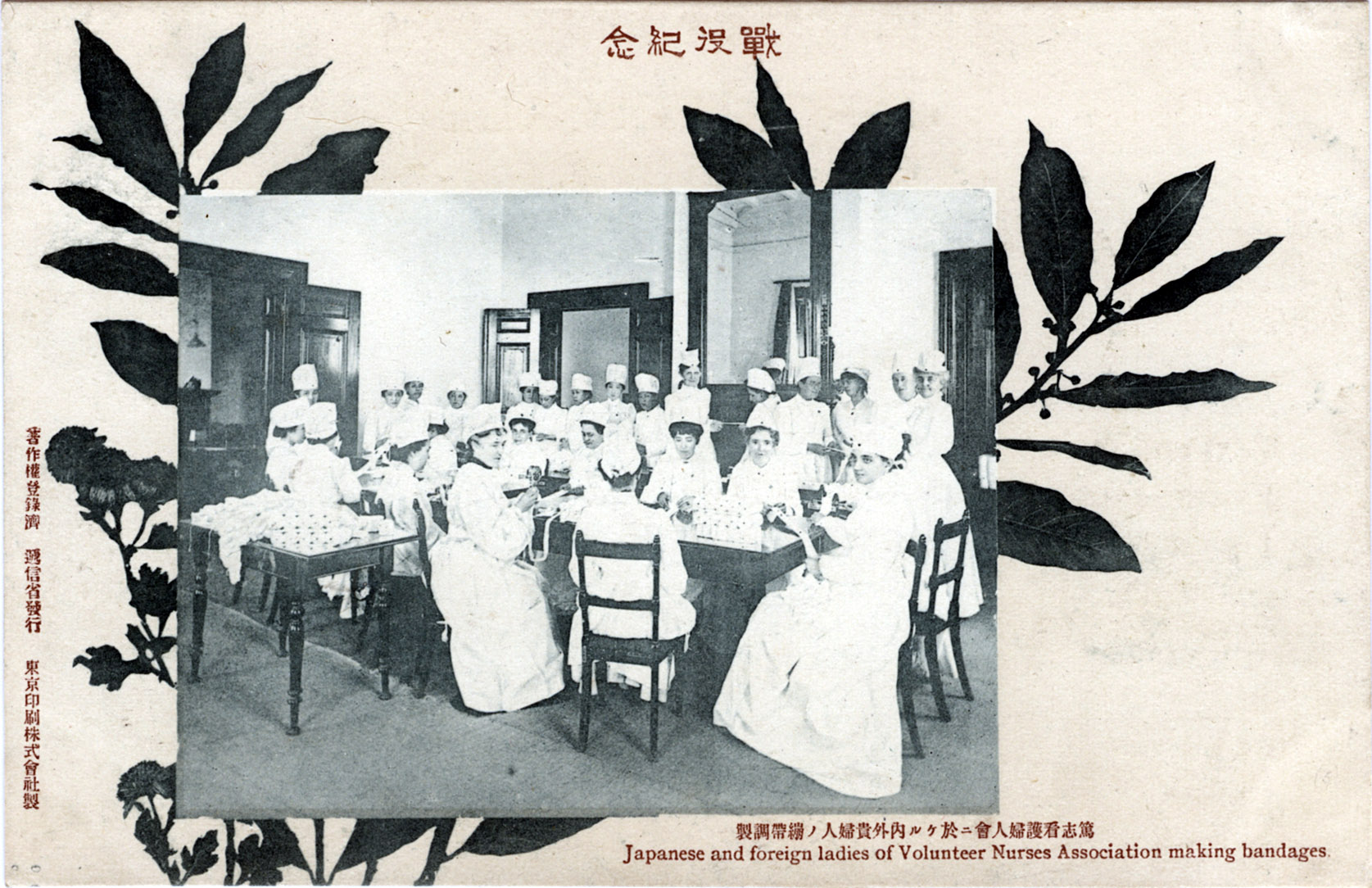 “… Other women of the imperial family and women of peerage engaged in similar activities. The empress herself dispatched women from her household to visit the sick and wounded in hospitals throughout Japan [such as] Marchionesses Nabeshima and Oyama, often acting as representatives of the Ladies’ Volunteer Nursing Association of the Japan Red Cross … The crown princess and Princess Arisugawa sent to the military authorities boxes of bandages they had rolled themselves, and the Ladies’ Volunteer Nursing Association met regularly to roll bandages and hear lectures given by authorities on military medicine.