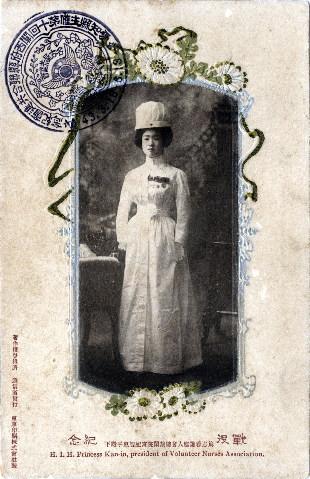 “H.I.H. Princess Kan-in, president of the Volunteer Nurses Association,” with a commemorative stamp dated 1910. The elite association was established in 1890 as an auxiliary of the Japan Red Cross which itself had been first established nationally in 1886.