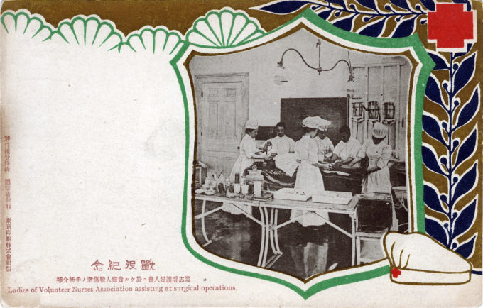 “Japanese and foreign ladies of the Volunteer Nurses Association making bandages,” c. 1905. Over 130,000 of these cards were printed as part of a set of 3, titled “Red Cross Set” which included this postcard and the ones above and below.