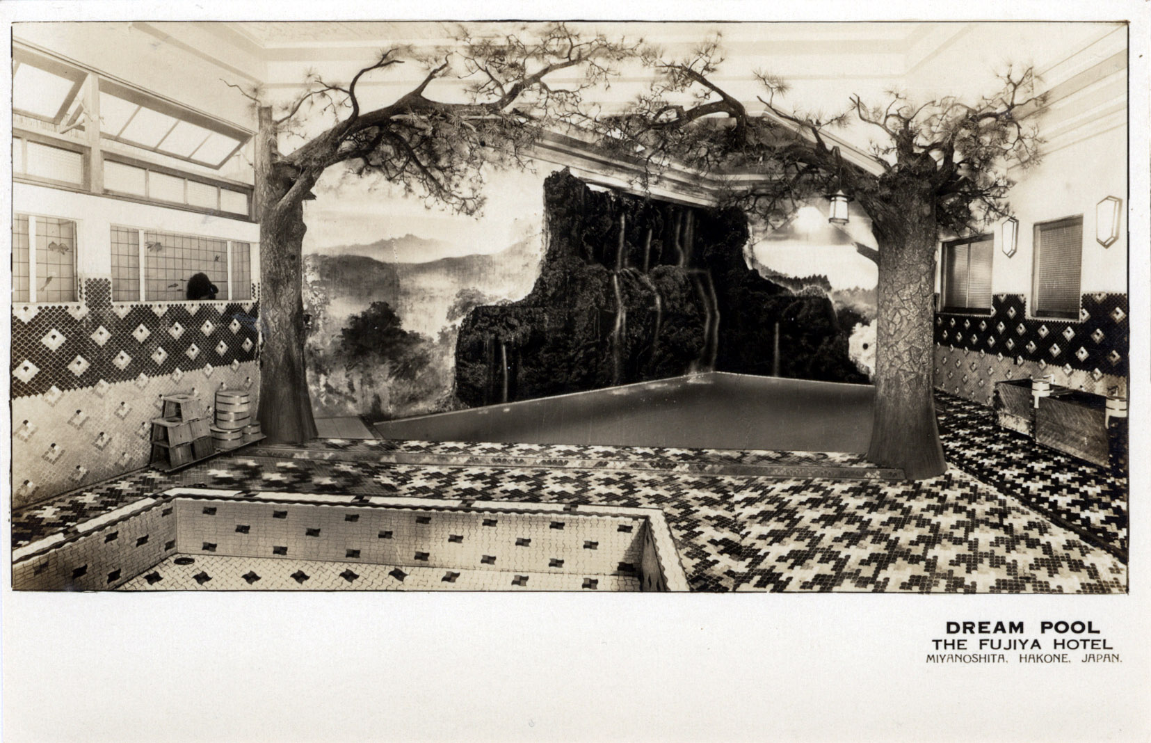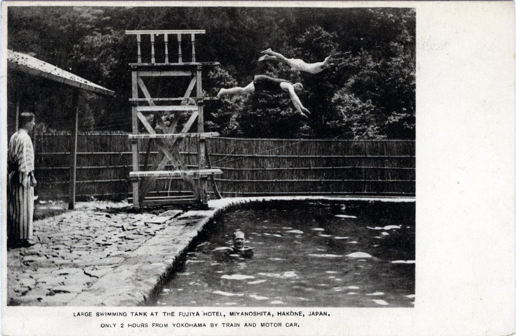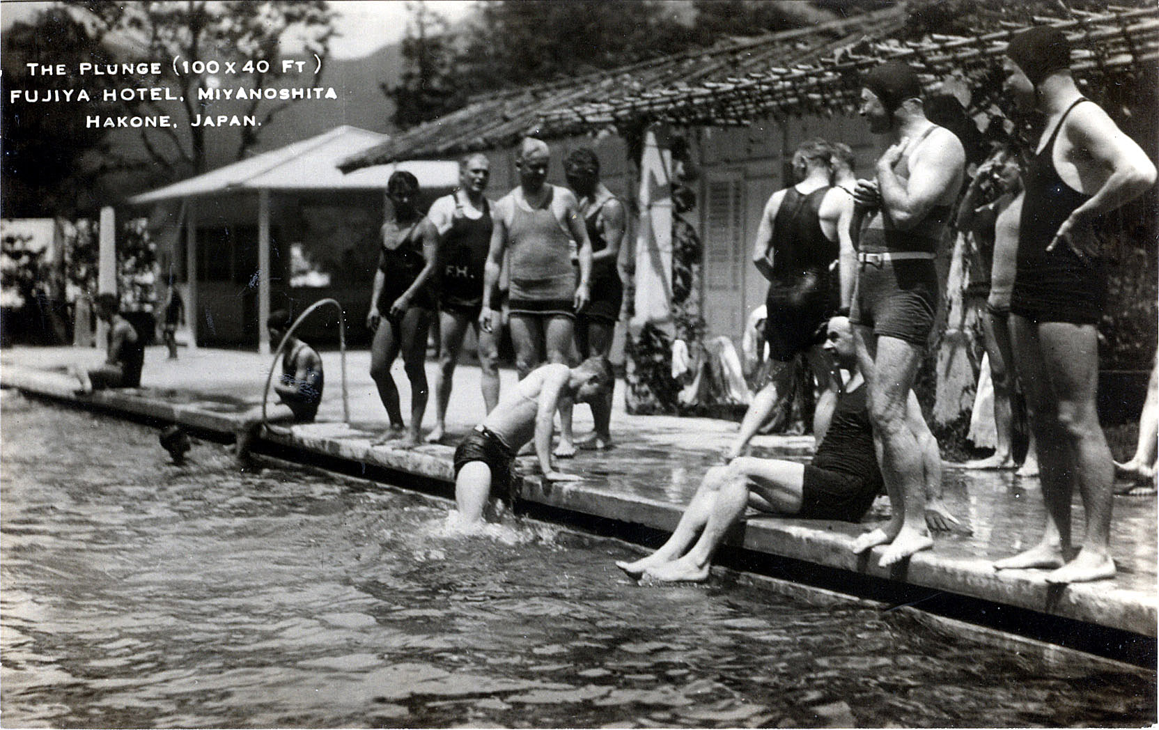 Outdoor pool, “The Plunge,” using cold and hot springs water depending on the season, Fujiya Hotel, Miyanoshita, c. 1930.